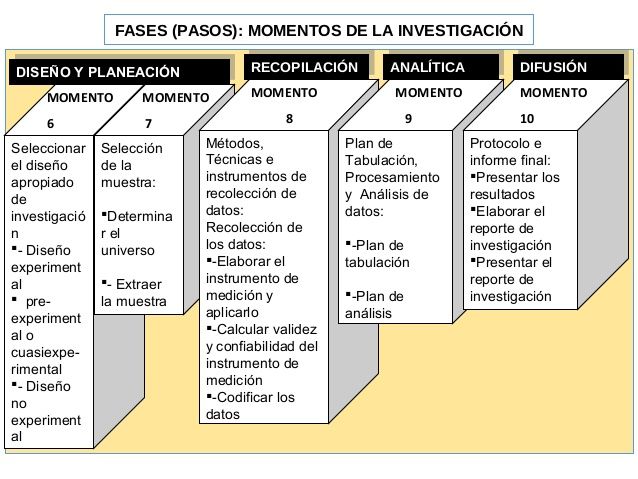 2. FASE DE PLANEACIÓN Y DISEÑOEsta fase es la principal de la investigación ). Se establecen las actividades y los recursos para llevar a cabo la investigación. Para esto debe visualizar los pasos sucesivos para llegar al objetivo planteado y las posibles dificultades que pueden presentarse a fin de buscar la solución antes que obstaculice el trabajo.La planificación del trabajo asegura al investigador los siguientes puntos: La sistematización de la materia que será objeto de estudio. Elaboración de un plan que requiere tiempo y reflexión. Ordenamiento lógico, sistemático que sirve como guía durante el proceso de investigación. PASOS A SEGUIR EN ESTA FASE: 1. Selección de un diseño.2. Identificación de la población a estudiar.3. Especificación de los métodos de obtención de datos.4. Diseño de del plan de muestreo.5. Generación y revisión del plan de investigación 6. Realización y revisión de un estudio piloto.3. FASE EMPÍRICALa observación es el procedimiento empírico básico. El objeto de la observación es un hecho actual del mundo interno y externo del observador. Puede caracterizarse como una percepción intencionada e ilustrada. Intencionada o deliberada porque se hace con un objetivo determinado. Ilustrada porque va guiada de algún modo por un cuerpo de conocimiento. Este momento abarca hasta el problema, planteamiento, fundamentación, objetivos. Variables e Hipótesis.4. FASE ANALÍTICA En este paso se analizan los datos obtenidos en las pruebas y tablas estadísticas. Corresponde a la aplicación de cómo serán tratados los datos recolectados. Para hacer evolución del fenómeno que representan. Aquí se detallan las técnicas estadísticas o cuantitativas de análisis utilizadas. Se debe justificar lo apropiado de su uso de acuerdo a la naturaleza de la medición o valoración de las variables.5. FASE DE DIFUSIÓN Consiste en evaluar y divulgar los resultados que se han venido recogiendo a través de las fases anteriores. Se considera la fase del proceso Investigativo. En general corresponde al procedimiento para demostrar regularidad, relaciones y hallazgos, sin importar sí los datos son o no cuantitativos.