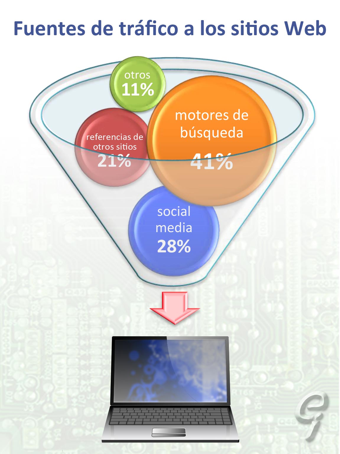 Fuentes de Tráfico Las fuentes de tráfico de una web son los distintos lugares desde los que llegan las visitas de los usuarios, y se denominan referral pages. La información sobre las fuentes de tráfico, además de sobre muchos otros aspectos, nos la facilita nuestra herramienta de Analítica Web. Un porcentaje normalmente no muy alto de las visitas a una web son tráfico directo, por ejemplo visitas espontáneas, es decir visitas de usuarios que dado que conocen la dirección (url) de la web que desean visitar y la incluyen directamente en el navegador para acceder a ésta. Un porcentaje alto (entre un 50% y un 80%) de las visitas a un site se producen desde los motores de búsqueda, es decir desde Google, Yahoo!, Bing, Ask, Yandex . . . gracias al interés de los usuarios de Internet en buscar información relacionada con el contenido y oferta de éste.
