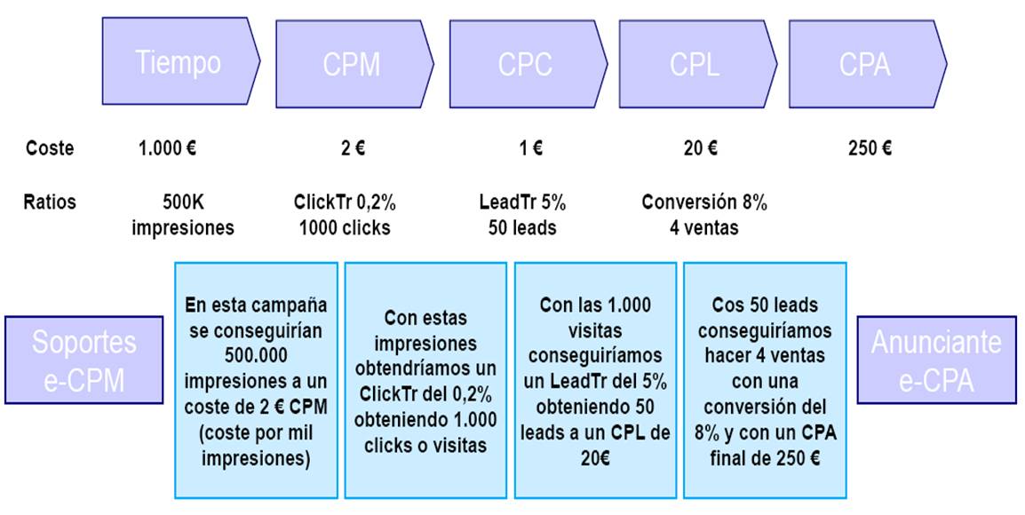 Modelos de contratación publicitarios Existen diferentes Modelos de Contratación Publicitaria, entre ellos destacaremos: CPM (Coste por mil impresiones servidas). Modelo de contratación publicitaria a través del cual el anunciante paga una cantidad establecida cada vez que se generan mil impactos publicitariosCPC (Coste por Click). Modelo de contratación publicitaria a través del cual un anunciante paga una cantidad fija cada vez que alguno de los usuarios alcanzados a través de una campaña de gráfica en Internet hace click en alguna de las piezas, independientemente del número de impresiones que se sirvan. CPL (Coste por Lead). Modelo de contratación publicitaria a través del cual el anunciante paga cada vez que un usuario es conducido a su Web Site y se registra en este. CPA (Coste por Adquisición). Modelo de contratación publicitaria a través del cual el anunciante paga cada vez que un usuario es conducido a su eStore/Plataforma de e-commerce y hace una compra.