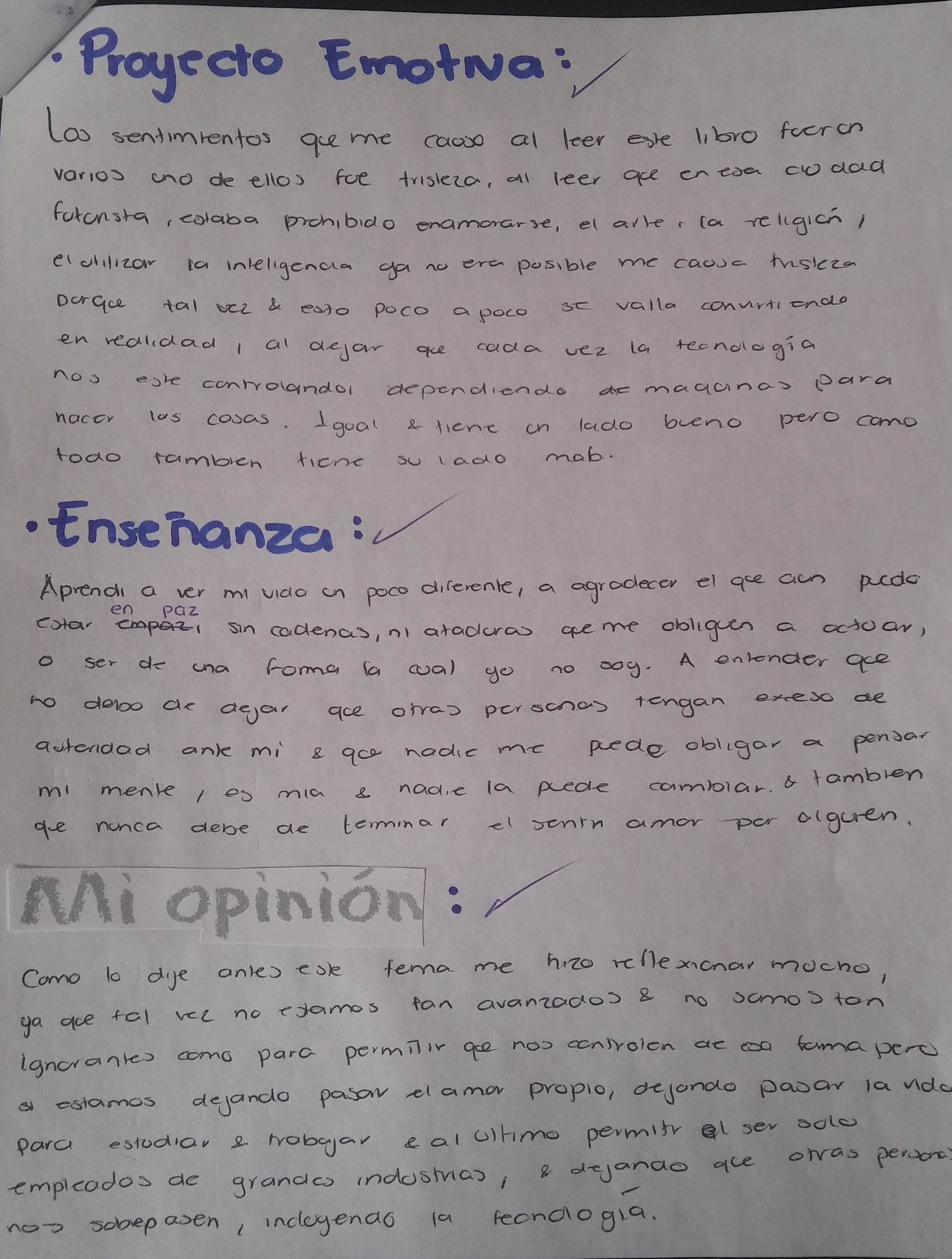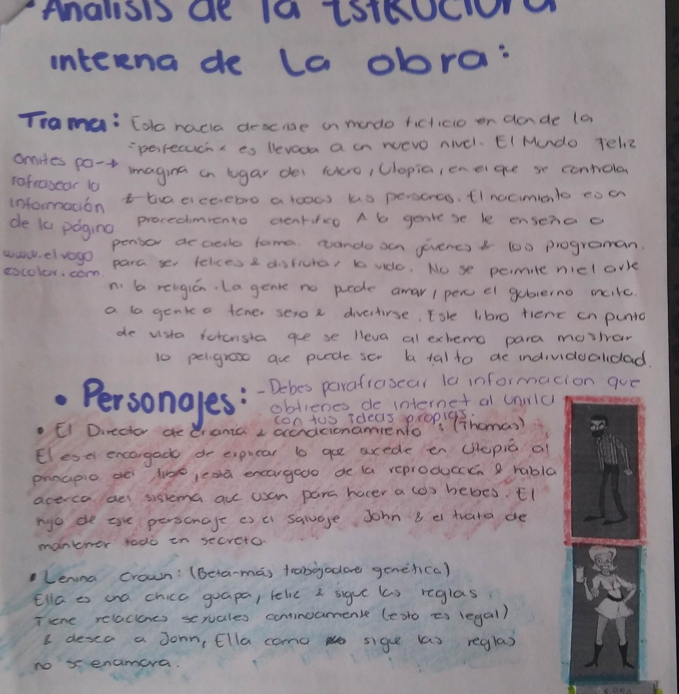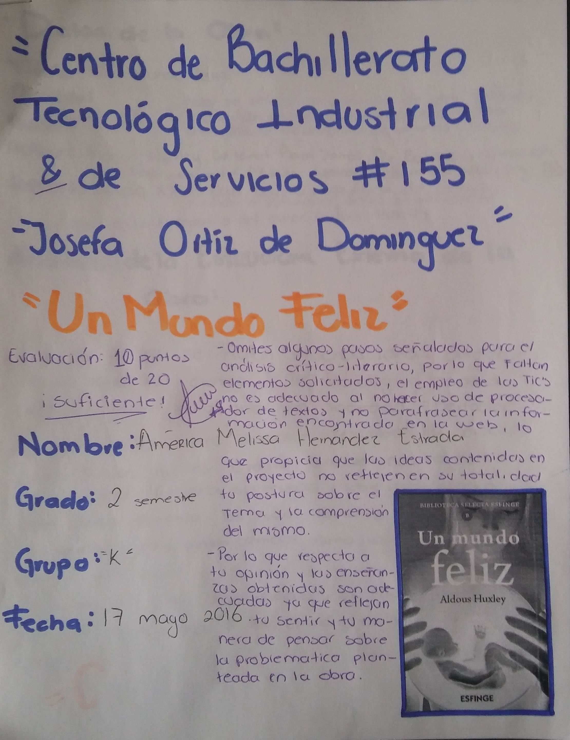 Tema: Análisis de textos literarios Evidencia: Práctica autónoma, Análisis crítico literario de novela filosófica. Propósito: Analiza textos literarios del género narrativo con carácter filosófico, hace una reflexión crítica de problemas sociales actuales con base en valores éticos y morales y emite juicios basado en argumentos lógicos. Competencias genéricas: 4. Escucha, interpreta y emite mensajes pertinentes en distintos contextos mediante la utilización de medios, códigos y herramientas apropiados. 6. Sustenta una postura personal sobre temas de interés y relevancia general, considerando otros puntos de vista de manera crítica y reflexiva. Competencias disciplinares: Comunicación 7. Valora y describe el papel del arte, la literatura y los medios de comunicación en la recreación o la transformación de una cultura, teniendo en cuenta los propósitos comunicativos de distintos géneros. 12. Utiliza las tecnologías de la información y comunicación para investigar, resolver problemas, producir materiales y transmitir información. Humanidades 7. Escucha y discierne los juicios de los otros de una manera respetuosa. 10. Asume una posición personal (crítica, respetuosa y digna) y objetiva, basada en la razón (lógica y epistemológica), en la ética y en los valores frente a las diversas manifestaciones del arte. Descripción: El alumno da lectura a la obra “Un mundo feliz” de Aldous Huxley, tomando como base los puntos analizados en clase y durante la práctica demostrativa, realiza un análisis crítico de los juicios emitidos por el autor y asume una posición personal sobre el tema empleando argumentos lógicos al defender su postura, para ello parte de lo general a lo particular, desde la descripción externa de la obra hasta la descripción particular de los personajes, para con ello emitir una conclusión reflexiva sobre los valores que son esenciales en nuestra sociedad. Finalmente, el estudiante, realiza un texto cuidando la redacción y la ortografía en donde plasma sus ideas y emplea las TIC’s para lograr el propósito comunicativo.