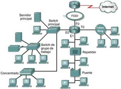 Los dispositivos de red son los que transportan los datos que deben transferirse entre dispositivos de usuario final. Los dispositivos de red proporcionanel tendido de las conexiones de cable, la concentración de conexiones, la conversión de los formatos de datos y la administración de transferencia de datos. Algunos ejemplos de dispositivos que ejecutan estas funciones son los repetidores, hubs, puentes, switches y routers. Todos los dispositivos de red que aquí se mencionan, se tratarán con mayor detalle más adelante en el curso. Por ahora se brinda una breve descripción general de los dispositivos de networking.
