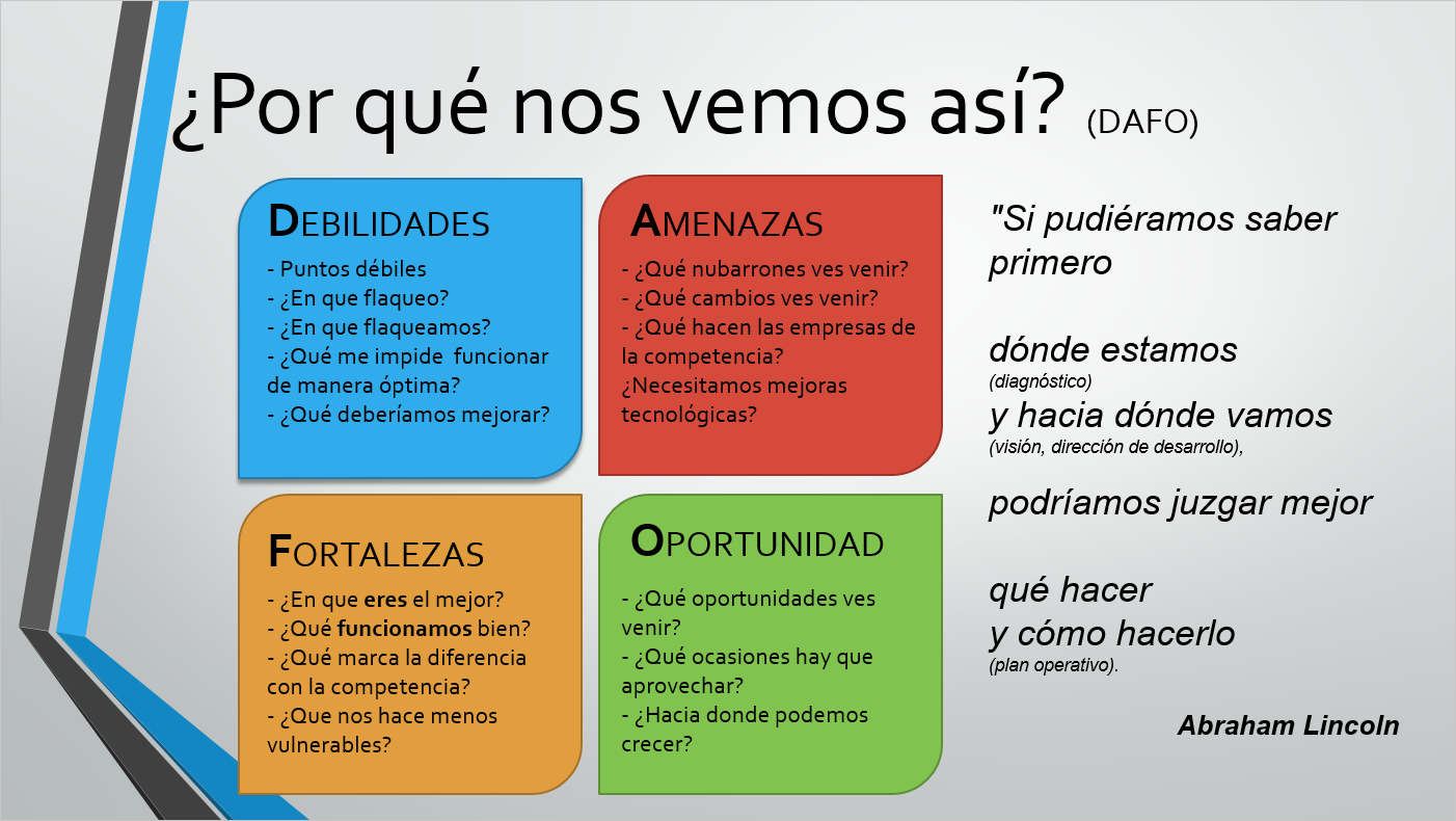 a) Aplicación del D.A.F.OEn esa línea, técnicas de análisis estratégico como el D.A.F.O. son fácilmente aplicables a la persona y permiten analizar su situación en el mercado como fuerza productiva. El análisis interno y el externo están una vez más interrelacionados y de sus diversas posibilidades emergen cuatro permutaciones posibles:Potenciar los puntos y las características más fuertes e importantes y disimular los más débiles del producto. Traducción al Marketing personal: Incrementar y dar mayor visibilidad a nuestras habilidades y destrezas personales y disfrazar nuestras áreas de mejoraAprovechar nuestras oportunidades y evitar posibles amenazas externas de competidores. Traducción al Marketing personal: Sacar partido de la oportunidades externas que se presentan y alejarse de los peligrosEl hecho de venderse a uno mismo no tiene grandes secretos: hay que conocer el ‘producto” y mostrarlo a los demás presentando su mejor cara. Se trata de resaltar nuestros puntos fuertes en los procesos de selección de personal.