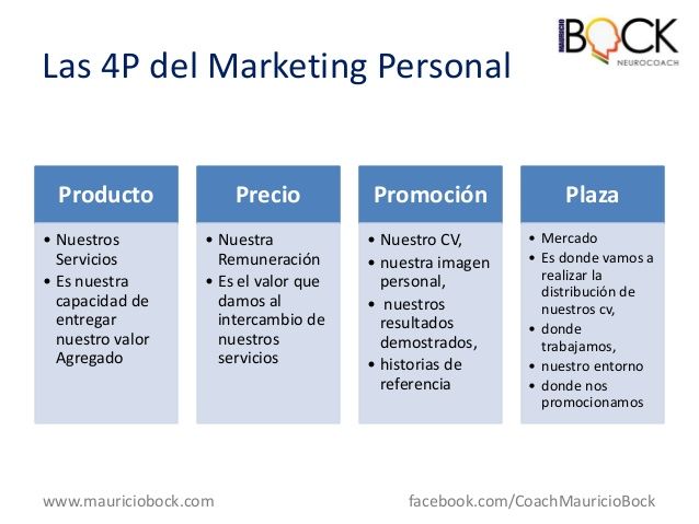 d) Aplicación de las cuatro P’sLa proyección de la propia tarea laboral puede ser igualmente analizada en función de las cuatro P’s que determinan el Marketing Mix:Product: es el propio individuo, su formación, su experiencia, sus actitudes, sus conocimientos, sus habilidades. ¿Qué es lo que aporto a la empresa?Price: el precio puede compararse al valor que tiene la prestación de nuestros servicios en el mercado laboral. ¿Hasta cuánto puedo exigir como sueldo sin dejar de ser rentable? ¿Cuánto estarían dispuestos a admitir mis competidores?Place: representa el canal mediante el cual el individuo puede hacer llegar sus servicios al mercado o “cliente final”. ¿Cuál es el contexto en el que puedo venderme? ¿A qué distancia estoy dispuesto a desplazarme para trabajar?Promotion: es la manera de darse a conocer, la forma qué damos a conocer nuestro perfil a nuestros “clientes” en el mercado laboral. ¿Doy a conocer adecuadamente el fruto de mi trabajo?. ¿Pasan desapercibidos mis éxitos y mis esfuerzos?