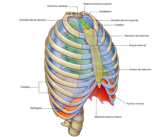 Realizado por: García Mendoza José de JesúsCAVIDAD TORÁCICA:La cavidad torácica es un espacio comprendido en la caja torácica que es una estructura osea en forma de cono aplanado, ubicado a partir de la primer costilla, hasta el linea imaginaria que pasa a nivel del apéndice xifoides y donde se forma el angulo de Charpy de 75°.Posee dos aberturas: Abertura torácica superior: esta conecta con el cuello, tiene una forma angosta y reniforme. Esta constituida por el cuerpo de la vertebra T1, posteriormente con el margen medial de la primera costilla a cada lado y el manubrio anteriormente. Abertura torácica inferior: es mas grande y expansible, sus margenes están constituidos por huesos, cartílagos y ligamentos. esta cerrada por el diafragma, las estructuras que pasan entre el tórax y el abdomen que lo atraviesan o pasan posteriormente al mismo. Compuesta por:1.- Pared torácica:-Formada por 37 huesos Cara anterior: Esternón. Cara posterior: 12 vertebras torácicas. Caras laterales: 24 costillas (12 de cada lado). -Formada por músculos divididos en capas: Capa externa: Músculos intercostales externos. Capa media: Músculos intercostales internos. Capa interna: Músculos profundos, músculos intercostales y el triangulo del esternón. 2.- Cavidades pleurales:Están situadas a ambos lados del mediastino, una para el pulmón izquierdo y otra para el derecho. cada cavidad pleural esta cubierta por una membrana mesotelial denominada pleura. durante el desarrollo los pulmones crecen a partir del mediastino.Cada pulmón permanece conectada al mediastino por un pedículo formado por la vía aérea, los vasos pulmonares, tejido linfático y los nervios. La pleura que recubre las paredes de la cavidad torácica es la pleura parietal, mientras que la que se refleja en el mediastino, en los pedículos y sobre la superficie en los pulmones el la pleura visceral.3.- Diafragma:Es un musculo tendinoso que sella la abertura torácica inferior, es el musculo mas importante de la respiración pero no es esencial, teniendo la función de llenar a los pulmones de aire, esta ubicado a la altura de T7.El diafragma se divide en tres porciones: La eternal, la vertebral y la costal. 4.- MEDIASTINO: Información en siguiente hoja