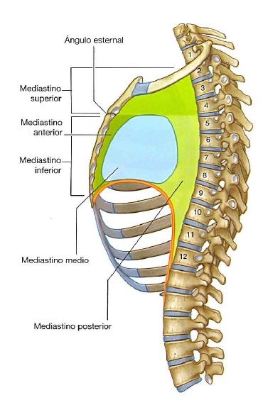 4.- MEDIASTINOEs un espacio virtual que solo se encuentra cuando este esta vació, ademas es la zona central amplia que separa a las dos cavidades pleurales situadas lateralmente.Contiene a los siguientes órganos y estructuras: Corazón Timo Saco pericárdico Tráquea Arterias principales Venas principales Se divide en dos porciones a través de un plano transversal que se extiende entre el ángulo del esternón hasta el disco intervertebral entre las vértebras T4 y T5: Mediastino superior Mediastino inferior El mediastino inferior a u vez se subdivide en tres porciones de delante hacia atrás: Mediastino anterior: Del área anterior al saco pericardio y posterior al cuerpo del esternón. Mediastino medio: Región posterior al saco pericárdico y al diafragma y anterior a los cuerpos vertebrales. Mediastino posterior: Es el área central que esta entre el mediastino anterior y posterior, contiene a los órganos importantes, entre ellos el corazón y el pericardio.