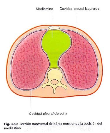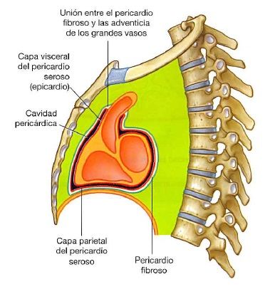 Pericardio:El pericardio es un saco fibroseroso que rodea al corazón y a la raíz de los grandes vasos y se encuentra en el mediastino medio.Se divide en dos tipos:1.-Pericardio fibroso: es una capa externa de tejido conjuntivo resistente que establece los limites del mediastino medio. Tiene forma de cono y tiene su base en el diafragma y cuyo vértice se continúa con la adventicia de los grandes vasos. su base esta unida al tendón central del diafragma,mientras que se une a la superficie posterior del esternón por medio de los ligamentos esternopericárdicos.Es inervado por los mismos nervios frenicos que inervan al diafragma y que se originan en los niveles espinales de C3 y C5, mientras que su irrigación esta dada por los vasos pericardiofrénicos. 2.-Pericardio seroso: ubicado dentro den pericardio fibroso. Este a su vez se divide en dos porciones: Capa parietal: recubre la superficie interna de la lamina fibrosa. Capa visceral (epicardio): esta dentro de la paca parietal y se adhiere al corazón y forma su cubierta externa. la capa parietal se continua con las capas viscerales en torno a la raíz de los grandes vasos a través de reflexiones las cuales son:Una superior: Rodeando a las arterias, la aorta y el tronco pulmonar. Contiene al seno pericárdico oblicuo.Una segunda más posterior: rodea a las venas, la vena cava superior e inferior y a las venas pulmonares.Ambas reflexiones se comunican por el seno pericárdico transverso.