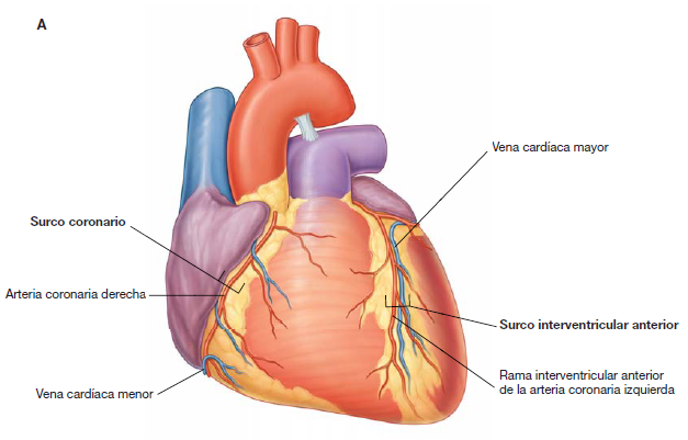 Tiene la forma de una pirámide triangular.Presenta tres caras: una anterior, otra inferior y otra izquierda. Posee tres bordes, una base un vértice.Su superficie presenta diversos surcos, los más importantes son los que separan las aurículas de los ventrículos y a las aurículas y ventrículos entre sí: Surco auriculoventricular: se extiende sobre las tres caras del corazón y cruza sus tres bordes. Por este surco pasan los vasos coronarios, razón por la que también se le llama surco coronario. Surco interventricular: separa a ambos ventrículos. Se divide en dos; surco interventricular posterior y surco interventricular anterior. Surco interauricular: separa a las aurículas entre sí. No se encuentra en la parte anterior del corazón CARAS DEL CORAZÓN1. Cara anterior o esternocostal.Constituida por un segmento ventricular y otro auricular. Segmento ventricular: convexo y triangular. Se encuentra dividido por el surco interventricular en una parte izquierda y otra derecha que corresponde cada una a su ventrículo. La parte izquierda que se observa en esta cara es muy pequeña. En la parte superior de este segmento se encuentran los orificios de las arterias aorta y pulmonar. Segmento auricular: Se observa sólo si se apartan los troncos arteriales. A cada lado las aurículas emiten unas prolongaciones que reciben el nombre de auriculillas o apéndices auriculares.