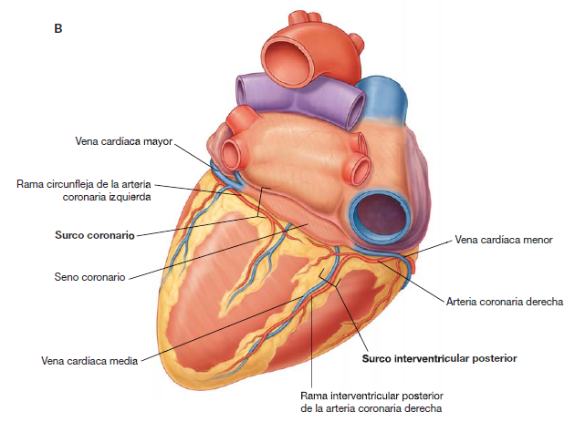 2. Cara posterior o diafragmática.Presenta en su porción ventricular el surco interventricular inferior que la divide en dos partes: la parte derecha más pequeña y la parte izquierda más amplia, cada una corresponde a su ventrículo. El surco interventricular inferior alcanza el vértice del corazón.El segmento auricular de esta cara es muy pequeño. A la derecha del segmento auricular se encuentra el orificio de la vena cava inferior el cual pertenece tanto a la cara inferior como a la base.