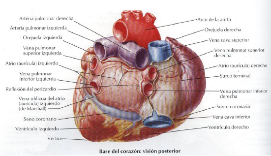 3. Cara lateral izquierda o pulmonar.Su porción ventricular corresponde totalmente al ventrículo izquierdo.Su porción auricular lleva auriculilla izquierda.4. BaseConstituida solamente por las aurículas, el surco interauricular la divide en dos segmentos: izquierdo y derecho que corresponden a las aurículas izquierda y derecha respectivamente. En la aurícula derecha se encuentra el orificio de la vena cava superior y un surco que limita la desembocadura de las venas cavas y la porción rectangular de la aurícula derecha formada por el seno venoso. El segmento izquierdo lleva los orificios de las cuatro venas pulmonares.