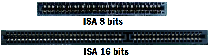 ISAEste bus fue el primero utilizado en PCs, y constaba de 8 lineas de datos y una frecuencia de reloj (aproximadamente) 8 MHz. Con esto, se obtenía un ancho de banda de 8 MB/s, suficiente para los procesadores 8088, pero muy pobre para procesadores avanzados. Así fue que el bus se extendió a 16 bits, con lo cual se duplico su ancho de banda .Mas informacion:https://en.wikipedia.org/wiki/Industry_Standard_Architecture