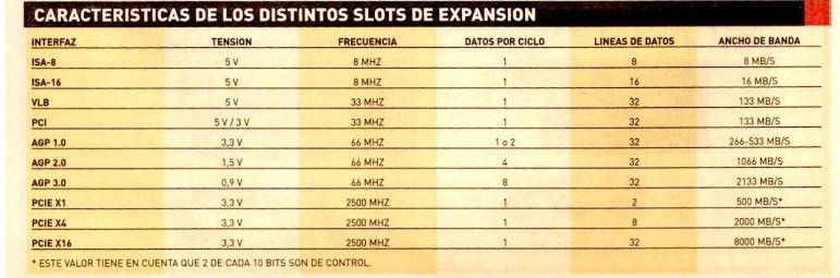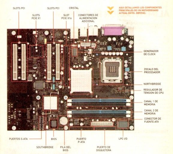 COMPONENTES PRINCIPALESLa motherboard tiene un conjunto de componentes, cada uno de estos tienen un funcionamiento especial.Fuente de alimentaciónLa PC tiene una fuente de alimentación que transforma la corriente alterna (normalmente con una tensión de 110 0 220 v) en corriente continua. La tarjeta madre se alimenta de esa corriente y la distribuye a todos sus componentes de acuerdo a sus necesidades. La formas de la fuente dependen del fabricante y de la complejidad del motherboard, pero se puede notar que cerca del zócalo del microprocesador, transistores MOSFET y una serie de capacitadores de gran tamaño e inductores, todos utilizados para filtrar la corriente y regularla con exactitud. En algunos casos, se emplean circuitos integrados para regular la tensión caso muy común en el microprocesador y la memoria RAM.Generador de ClockLas diferentes señales de reloj en la tarjeta madre son generadas por un pequeño cristal de cuarzo y este esta conectado a un generador de clock, los restos de conexiones son para los demás componentes como la memoria RAM, los chipset, los puertos USB entre otros.Del generador de clock depende las cualidades de la tarjeta madre para poder incrementar la frecuencia del bus frontal y de la memoria. Este generador esta diseñado para una familia en especial de chipset y supera las posibilidades de los mismos.ChipsetEl chipset son un conjunto de chips llamados Northbridge y Southbridge que se encargan de administrar el flujo de información entre los dispositivos de la tarjeta madre, el chipset es considerado el secretario del procesador ya que se encarga de manejar todos los pedidos de este y de manejar el trafico de datos. Estos no pueden trabajar con cualquier tipo de frecuencias, deben tener una cierta relación entre los componentes para que el chipset pueda relacionarlas correctamente, por eso no todas las conexiones ofrecidas por el clock funcionaran con un chpset determinado. Por ejemplo algunos generados permiten fijar la frecuencia de PCI a 33 MHz y hacer que no tenga relación alguna con el FSB, pero solo los chipsets mas nuevos soportan esta caracteristica. Sus funciones es controlar el AGP, PCI Express, PCI, puertos IDE, de disquera, memoria, puertos USB, Firewire e incluso funciones de sonido y red.BiosEs un software que esta impreso en un chip de manera rectangular o cuadrada (memoria tipo Flash EEPROM) , es el primer programa que accede al microprocesador no bien se enciende el equipo. Se encuentra conectado al super chip LPC. La bios es la encarga de abrir o cerrar las llaves del chipset, estas son configuraciones de velocidad o la memoria. La bios no puede modificar el hardware, así que esta conectado a diversos dispositivos diseñados exclusivamente para modificar las llaves y permitir una configuración dinámica de los parámetros del generador de clock y del regulador de tensión del procesador, la memoria, el AGP, y otros componentes.Puertos En las primeras PCs, los puertos a los que accedía el procesador eran controlados por chip dedicados a cada uno, por ejemplo controlador del teclado(Intel 8042), el de los puertos de serie y de los puertos en paralelo y que también tenia un contador que realizaba tarea como el refrescar la memoria RAM, hoy en dia esas tareas las realiza el LPC debido a que utilizando este tipos de integrados se ahorran muchos pines, este chip tiene una única entrada de clock y una velocidad de 24 MHz se encuentra conectado al Southbridge del chipset y tiene un acceso muy lento al procesador aunque no necesita mas velocidad debido a que sus funciones no la requieren. Ademas el super I/O posee comúnmente el puerto de disquera, puertos para Joystick, sensores de temperatura, reguladores de velocidad para coolers. También tiene la interfaz de memoria EEPROM para conectar al BIOS.Slots de expansiónExisten slots de expansión.ISA Este tipo ya no se usa, si bien ya no encuentra en tarjetas madres actuales, el bus ISA tiene buena historia su sencillez (en el PCI), hay quienes aun experimentan con el. Este bus fue el primero utilizado en PCs, y consta con ocho lineas de datos y una frecuencia de reloj cerca de 8MHz, con esto se obtenía un ancho de banda de 8 Mb/s , era suficiente para procesadores 8088 pero con procesadores actuales no, debido a esto el bus se extendió a 16 bits.PCIEl PCI es la evolución del ISA, con el concepto de "Bus local" implementando en la ultima extensión de aquel (el VLB). La idea era tener un bus cuya frecuencia de trabajo estuviera sincronizada con el procesador.Este utiliza una 32 líneas de datos, exactamente igual cantidad que el bus de 486, como se ve esta interfaz resultaba adecuada para este tipo de procesadores, pero estos se quedaron atrás cuando llego Pentium (bus de 66 MHz y 64 bits), ya que su ancho de banda era cuatro veces inferior. El PCI tuvo dos versiones diferentes: la primera con una tensión de 5 v (igual que ISA) y la segunda de 3.3 v. Un problema extra es que todos sus Slots están conectados en paralelo, es decir que todos comparten el mismo ancho de banda (1066 MHz).AGP Este bus fue implementado en 1997, dedicado especialmente para tarjetas de video. Era muy parecido al PCI, pero conectado directamente al Northbridge, para facilitar el acceso al procesador y a la RAM. La primera revisión de AGP trabajaba a una frecuencia base de 66 MHz y con 32 bits de datos, es decir duplicaba el ancho de banda de la PCI, esta especificación trabajaba a 3,3 v, permitía transferir datos por flanco del ciclo del clock (como las DDR). Más tarde esta norma se actualizo en revisión 2.0, que utiliza un pipelining para transferir datos cuatro datos por ciclo (AGP 4X). En su última versión 3.0 trabaja con velocidades de AGP8X, y tensión de .9 v. PCI EXPRESS El bus más moderno es el PCI Express, que se basa en la transferencia de datos de serie. Esto se refiere a que cada slot básico de PCIE tiene su propia línea de datos con una velocidad muy alta de 2.5 GHz. En teoría