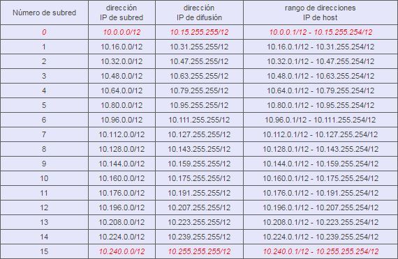 El proceso de creación de subredes comienza prestando al rango de host la cantidad de bits nesesaria para la cantidad de subredes que queremos obtener. En esta acción de pedido tienes que dejar como mínimo dos bits del rango de host.Clase A cantidad de bits disponible 22 bits Clase B cantidad de bits disponible 14 bitsClase C cantidad de bits disponible 6 bitsEjemplo para la red clase A.Primero hacemos un cálculo de la máscara de subred.Para obtener por ejemplo las 9 subredes válidas, tenemos que calcular el rango de los bits necesarios para el direccionamiento de las subredes. 2N-2=número de subredes. N - número de bits.La razón de restar estos dos números de subredes es porque la dirección con los bits a 0 es la dirección IP de la red original y con los bits a 1 es la dirección broadcast de la red original.24-2=14 En nuestro caso aprovechamos 4 bits (con 3 bits disponemos en maximo 8 subredes - 6 válidas) para calcular la máscara e direccionamiento IP de nuestros suredes.La máscara de red clase A:en binario 11111111 . 00000000 . 00000000 . 00000000 y en decimal 255.0.0.0 (/8)Para obtener la máscara de subred utilizamos 4 bits de rango de host - los 4 bits ponemos a 1:en binario 11111111 . 11110000 . 00000000 . 00000000 y en decimal 255.240.0.0 (/12)