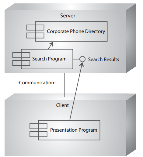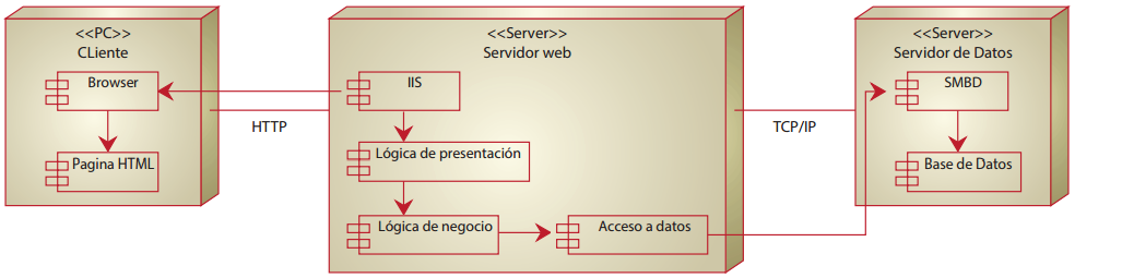1.1.3.2. Sistemas cliente-servidor: En los diagramas de despliegue para sistemas cliente servidor se debe especificar claramente la conectividad de la red y la ubicación de los componentes dentro de los nodos. Una de las características de estos sistemas es la separación de la interfaz gráfica de usuario que generalmente es manejada por los clientes y la lógica de procesamiento y datos que generalmente están ubicados en otros nodos.