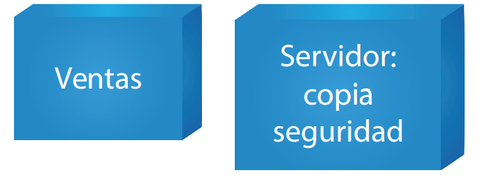Los elementos utilizados para realizar un diagrama de despliegue son los nodos (representados por un prisma), componentes y asociaciones.1.1.1. Elementos de un diagrama de despliegue1.1.1.1. NodoUn nodo es un objeto físico en tiempo de ejecución que representa un recurso computacional, generalmente con memoria y capacidad de procesamiento; debe tener un nombre representativo de la partición física que simboliza, y lo distingue del resto de nodos. Los nodos al representar objetos físicos que se utilizarán durante la ejecución del sistema, pueden ser: • Procesadores: Nodo con capacidad de procesamiento. Puede ejecutar un componente.Dispositivos: Nodo sin capacidad de procesamiento. Representa cualquier otro dispositivo hardware. Un nodo se representa con la figura de un cubo, como puede verse a continuación. Un nodo también puede ser una instancia, y se representa por un nombre subrayado y lo preceden dos puntos (:) opcionalmente