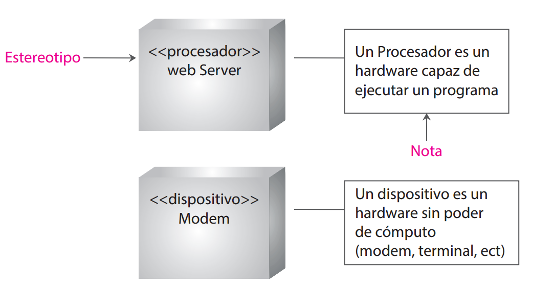 antes de los dos puntos puede ir el tipo de nodo. Los nodos también suelen llevar estereotipos que sirven para identificarlo, como por ejemplo <<procesador>>, <<dispositivo>>, <<servidor >>, <<pc>>, etc.