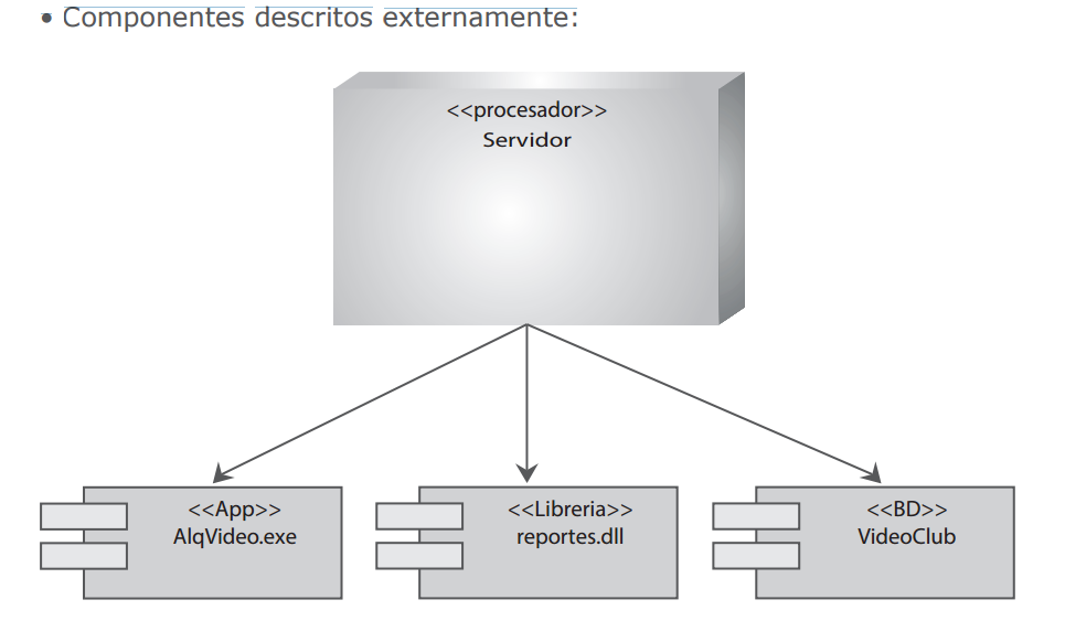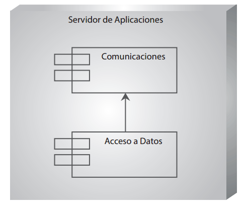1.1.2. ComponentesPara hacer más comprensible el diagrama de despliegue, dentro de los nodos se debe incluir los componentes definidos para la aplicación, que permitirán identificar en qué lugares particulares deben localizarse los elementos de software que integran la aplicación. Los diagramas a continuación presentan algunos ejemplos de representación. • Componentes dentro del nodo: