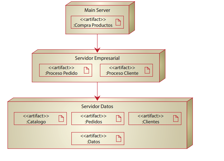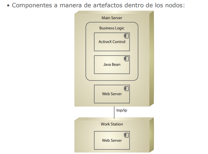 Se recomienda construir un diagrama general y otros que detallen la implementación de componentes en los nodos de manera detallada, pero principalmente distinguir los nodos clientes y los nodos procesadores del sistema.1.1.3.3. Sistemas completamente distribuidosLos diagramas de despliegue que se realizan para representar sistemas distribuidos, normalmente incluyen varios niveles de servidores, en estos casos el diseño del sistema requiere tener énfasis especial en el atributo de mantenibilidad sobre el sistema, para permitir posteriores cambios en la topología del sistema. Como en estos sistemas los aspectos relacionados con la red son muy importantes, se deben incluir dispositivos de comunicación y detalles sobre su rendimiento. También en el diseño se incorporarán agrupaciones lógicas de nodos que pueden presentarse a través de paquetes. Otro aspecto importante son las bases de datos que estarán distribuidas por el modelo y deben ser presentada esa organización adecuadamente. Nota: a veces es frecuente representar la propia red como un nodo (por ejemplo) Internet puede ser representada como un nodo). Se puede representar una red de área local (LAN) o una red de área extendida WAN.GLOSARIO Artefacto: entidades físicas que se presentan en nodos, dispositivos y ambientes de ejecución. Dispositivo: componente que puede ser de acceso a datos, periférico de entrada o salida de datos. Nodo: objeto físico que existe en tiempo de ejecución, y que representan algún tipo de recurso computacional (capacidad de memoria y procesamiento). Procesador: Circuito integrado que contiene los elementos de una Unidad Central de Procesamiento.Topología: Identifica la forma como se distribuyen y comunican los diferentes elementos de un conjunto.RECURSOS BIBLIOGRÁFICOSJames Rumbaugh, G. B. (2006). El Lenguaje unificado de modelado: manual de referencia (Vol. 2ª edición). Pearson Educación.James Rumbaugh, G. B. (2007). El Lenguaje Unificado de Modelado. Manual de Referencia (Vol. 2ª edición). Pearson Educación.