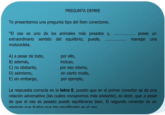 Aprenderás algunos conceptos y claves para entender el uso y funcionamiento de los conectores. Es importante tener presente que si bien los debes conocer teóricamente es incompleto el aprendizaje si no los ejercitas.Los conectores son para la comunicación como las articulaciones son a los huesos, es decir, permiten la organicidad entre partes de un enunciado, en ello radica su importancia.* Objetivo de Medición:El propósito de este ítem es evaluar la competencia lingüística del estudiante para resolver enunciados incompletos a los que se debe restituir su cohesión sintáctica y coherencia semántica. En otras palabras, debe seleccionar el o los enlaces adecuados para que la cadena discursiva sea comprensible, coherente y precisa. Estos enlaces o conectores, son unidades gramaticales que actúan como elementos de unión dentro de una oración o entre varías oraciones para dar consistencia al discurso.