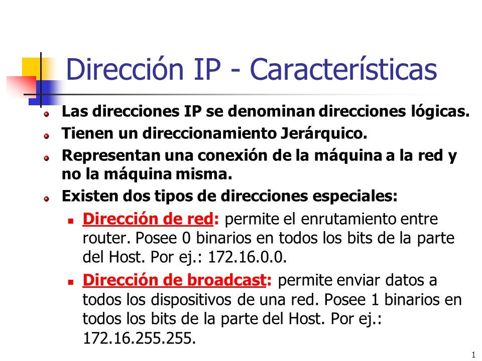 Una dirección IP es una dirección de 32 bits, escrita generalmente con el formato de 4 números enteros separados por puntos. Una dirección IP tiene dos partes diferenciadas: los números de la izquierda indican la red y se les denomina netID (identificador de red).los números de la derecha indican los equipos dentro de esta red y se les denomina host-ID(identificador de host).Veamos el siguiente ejemplo: Observe la red, a la izquierda 194.28.12.0. Contiene los siguientes equipos: 194.28.12.1 a 194.28.12.4 Observe la red de la derecha 178.12.0.0. Incluye los siguientes equipos: 178.12.77.1 a 178.12.77.6En el caso anterior, las redes se escriben 194.28.12 y 178.12.77, y cada equipo dentro de la red se numera de forma incremental. Tomemos una red escrita 58.0.0.0. Los equipos de esta red podrían tener direcciones IP que van desde 58.0.0.1 a 58.255.255.254. Por lo tanto, se trata de asignar los números de forma que haya una estructura en la jerarquía de los equipos y los servidores. Cuanto menor sea el número de bits reservados en la red, mayor será el número de equipos que puede contener. De hecho, una red escrita 102.0.0.0 puede contener equipos cuyas direcciones IP varían entre 102.0.0.1 y 102.255.255.254 (256*256*256-2=16.777.214 posibilidades), mientras que una red escrita 194.24 puede contener solamente equipos con direcciones IP entre 194.26.0.1 y 194.26.255.254 (256*256-2=65.534 posibilidades); ésta es el concepto de clases de direcciones IP.