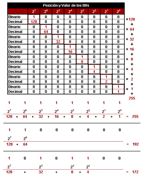 Cuando trabajamos con una red pequeña no encontramos muchos problemas para configurar el rango de direcciones IP para conseguir un rendimiento óptimo.Pero a medida que se van agregando host a la red, el desempeño empieza a verse afectado. Esto puede ser corregido, en parte, segmentando la red con switches, reduciendo los Dominios de colisión (host que comparten el mismo medio) enviando las tramas solo al segmento correcto. Pero aunque se reducen las colisiones con tomar estas medidas, si se continúa aumentando el número de host, aumentan también los envíos de broadcast (Envió de paquetes a todos los dispositivos de la red). Lo que afecta considerablemente el desempeño de la red. Esto se debe a que los Switches solo segmentan a nivel de MAC Address y los envíos de broadcast son a nivel de red 255.255.255.255 . Es aquí donde el Subneteo nos ayuda. Subneteando la red tendremos, en su conjunto, una sola IP address divida en varias subredes más pequeñas bien diferenciadas, consiguiendo un mayor control y reduciendo el congestionamiento por los broadcast.LA IPIp se refiere a el conjunto de 32 bits que identifican a la red y a la máquina estos 32 bits están divididos en 4 octetos de 8 bits cada uno.LOS OCTETOSEn la Ip se divide en 4 partes de 8 bits cada uno, por ejemplo una ip cualquiera seria 255.192.172.0 en este caso los octetos son:Primer Octeto: 255Segundo Octeto: 192Tercer Octeto: 172Cuarto Octeto: 0Pero acá no se ve nada de octetos pero en realidad estos números son representaciones de los bits, los bits pueden ser 0 o 1 y recordando clases de electrónica nos dijeron que el 0 es apagado y el 1 es encendido bueno y aparir de esto tendríamos que convertir estos números a el sistema binario para poder comprender el significado de los octetos.Transformando los números al sistema binario:El 1 significa que el 2 va a estar elevado a la potencia de acuerdo a la posición del 1 contando de derecha a izquierda comenzando la cuenta en 0 y luego los resultados se suman, teniendo en cuenta de que el 0 no tendría valor por lo que significa 0.La combinación de 8 bits permite un total de 256 combinaciones posibles que cubre todo el rango de numeración decimal desde el 0 (00000000) hasta el 255 (11111111). Algunos ejemplos.