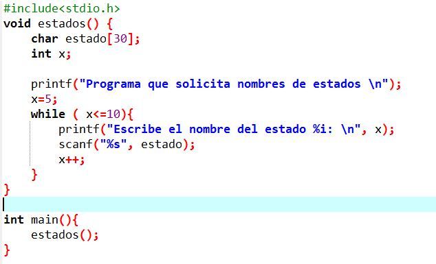 El ciclo while ( ) se puede utilizar de dos formas muy prácticas: cuando necesitamos que se repita un proceso un número determinado de veces cuando la decisión de repetición, la tiene el usuario. Por ejemplo:#include<stdio.h> void estados() { char estado[30]; int x; printf("Programa que solicita nombres de estados \n"); x=5; while ( x<=10){ printf("Escribe el nombre del estado %i: \n", x); scanf("%s", estado); x++; }}int main(){ estados();}---------------Otro ejemplo, cuando el usuario decide....