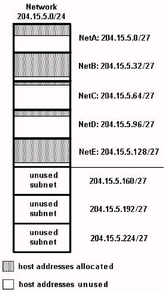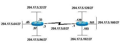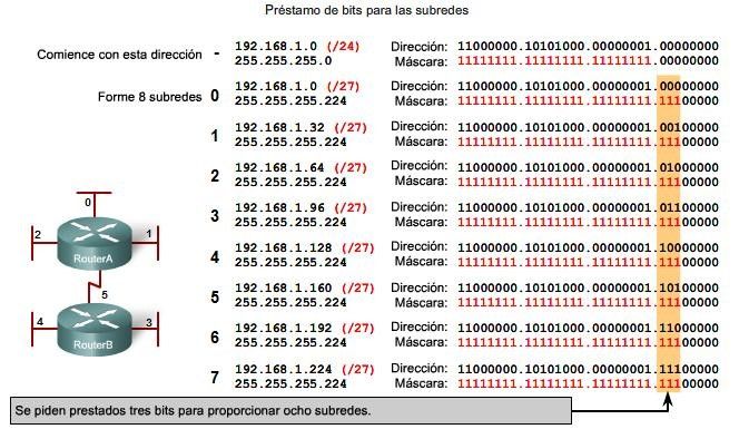 Observe que cada uno de los routers de la Figura 2 está asociado a cuatro subredes, una subred es común a ambos routers. Además, cada router tiene una dirección IP para cada subred a la que está asociada. Cada subred podría dar soporte hasta a 30 direcciones de host. Cuantos más bits host use para una máscara de subred, más subredes tendrá disponibles. Sin embargo, cuantas más subredes haya disponibles, menos direcciones de host estarán disponibles por subred. Por ejemplo, una red Clase C de 204.17.5.0 y una máscara de 255.255.255.224 (/27) permite tener ocho subredes, cada una con 32 direcciones de host (30 de las cuales podrían asignarse a dispositivos)Ahora que comprende la creación de subredes, ponga en práctica estos conocimientos. En este ejemplo se dan dos combinaciones de dirección/máscara, escritas con la notación prefijo/longitud, que se han asignado a dos dispositivos. Su tarea consiste en determinar si estos dispositivos están en la misma subred o en subredes diferentes. Puede hacer esto utilizando la dirección y la máscara de cada dispositivo para determinar a qué subred pertenece cada dirección. DeviceA: 172.16.17.30/20 DeviceB: 172.16.28.15/20 Determinación de la Subred para DeviceA: 172.16.17.30 - 10101100.00010000.00010001.00011110 255.255.240.0 - 11111111.11111111.11110000.00000000 -----------------| sub|-----------subnet = 10101100.00010000.00010000.00000000 = 172.16.16.0 Si observa los bits de dirección que tienen el bit de máscara correspondiente establecido en uno, y establece todos los demás bits de dirección en cero (el equivalente de un "AND" lógico entre la máscara y la dirección) verá a qué subred pertenece esta dirección. En este caso, DeviceA pertenece a la subred 172.16.16.0. Determinación de la Subred para DeviceB: 172.16.28.15 - 10101100.00010000.00011100.00001111 255.255.240.0 - 11111111.11111111.11110000.00000000 -----------------| sub|-----------subnet = 10101100.00010000.00010000.00000000 = 172.16.16.0 A partir de estas determinaciones, DeviceA y DeviceB tienen direcciones que forman parte de la misma subred. Ejemplo VLSM En todos los ejemplos anteriores de creación de subredes, observe que se aplicó la misma máscara de subred para todas las subredes. Esto significa que cada subred tiene la misma cantidad de direcciones de host disponibles. Puede que en algunos casos lo necesite, pero, en la mayoría de los casos, tener la misma máscara de subred para todas las subredes termina por desperdiciar espacio de direcciones. Por ejemplo, en la sección Ejercicio de ejemplo 2, se dividió una red de Clase C en ocho subredes de igual tamaño; sin embargo, cada subred no utilizaba todas las direcciones de host disponibles, lo que provocaba el desperdicio de espacio de direcciones. La siguiente figura ilustra este espacio de direcciones desperdiciado.