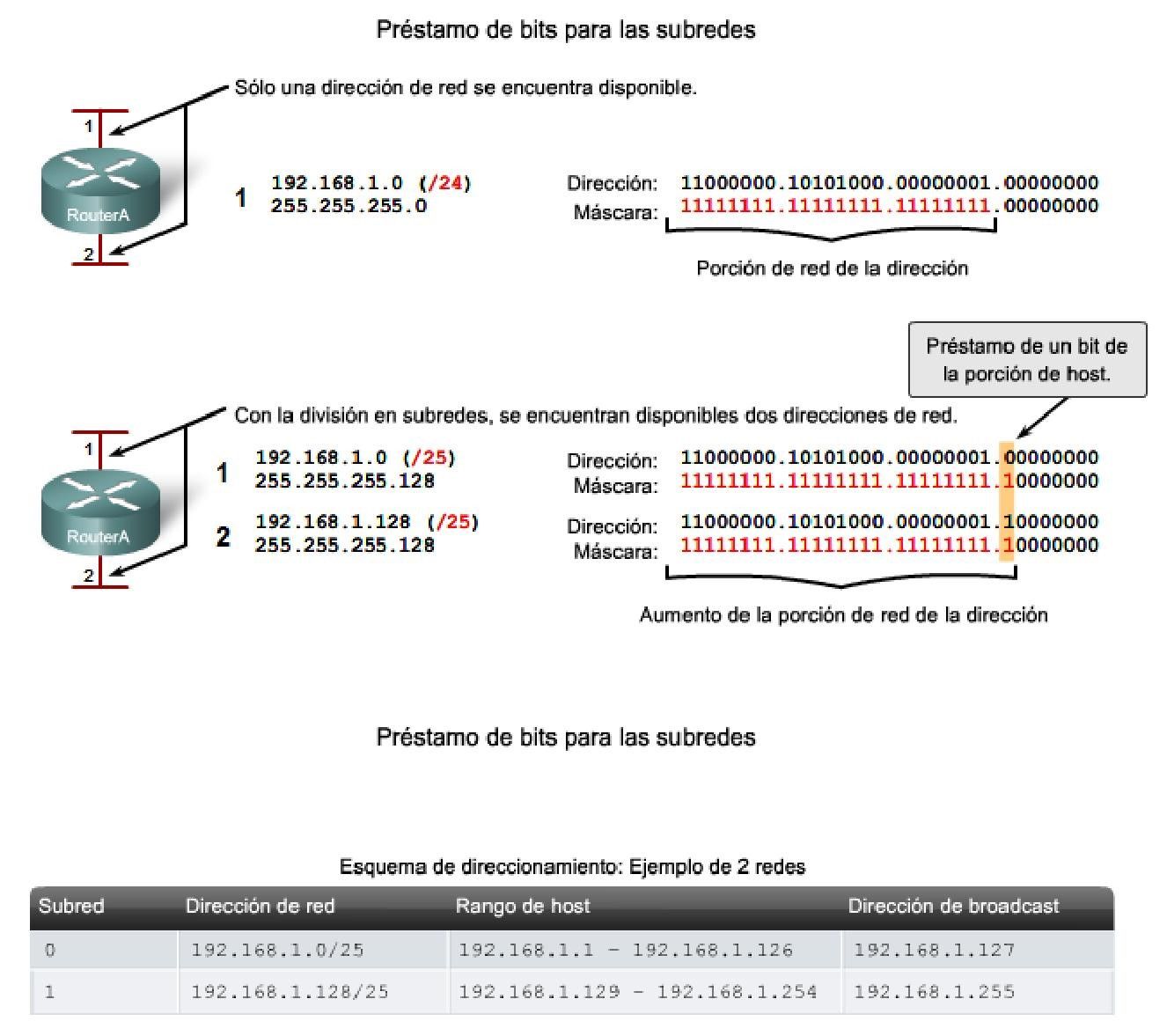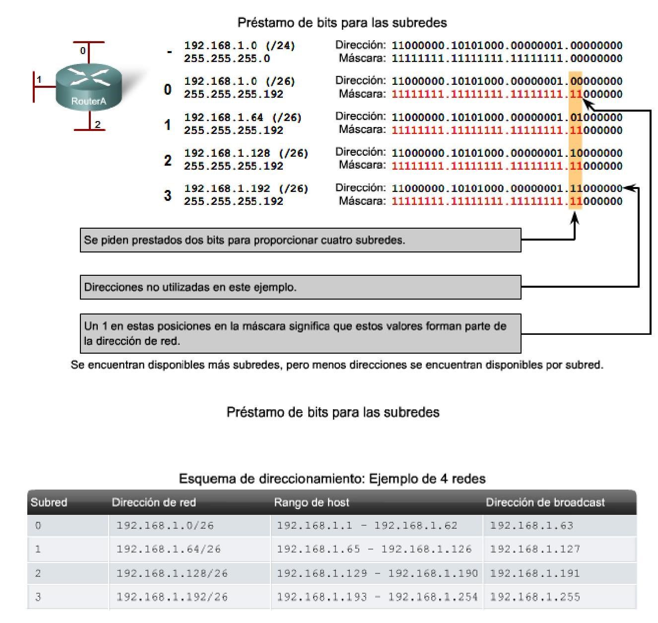 Principios de la división de subredes Ejemplo con 3 subredes A continuación, una internetwork que requiere tres subredes. Nuevamente, se comienza con el mismo bloque de direcciones 192.168.1.0 /24. Tomar prestado un solo bit proporcionará únicamente dos subredes. Para proveer más redes, se cambia la máscara de subred a 255.255.255.192 y se toman prestados dos bits. Esto proveerá cuatro subredes. 2^2 = 4 subredes Cantidad de hosts subredes. · Subred 0: 0 = 00000000 · Subred 1: 64 = 01000000 · Subred 2: 128 = 10000000 · Subred 3: 192 = 11000000 Aplicando la fórmula de cálculo de host. 2^6 ‐ 2 = 62 hosts por subred Observe la figura del esquema de direccionamiento para estas redes.