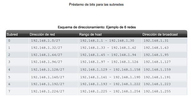Ejemplo con 6 subredes Considere este ejemplo con cinco LAN y una WAN para un total de 6 redes. Observe la figura. Para incluir 6 redes, coloque la subred 192.168.1.0 /24 en bloques de direcciones mediante la fórmula: 2^3 = 8 Para obtener al menos 6 subredes, pida prestado tres bits de host. Cantidad de hosts. Para calcular la cantidad de hosts, comience por examinar el último octeto. · 0 = 00000000 · 32 = 00100000 · 64 = 01000000 · 96 = 01100000 · 128 = 10000000 · 160 = 10100000 · 192 = 11000000 · 224 = 11100000 Aplique la fórmula de cálculo de host: 2^5 ‐ 2 = 30 hosts por subred.