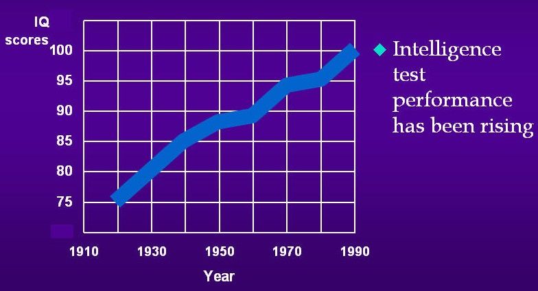El siglo XX, experimento el efecto Flynn: "Fenómeno que consiste en el incremento notable del CI de una generación a otra"Recuperado de: http://www.webdocente.altas-capacidades.net/Articulos/PDF/Art3/5_El_efecto_Flinn.pdf
