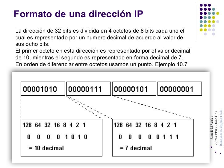Direcciones IP Una dirección IP (Protocolo Internet) es una serie de cuatro números que se utilizan para identificar exclusivamente un cliente o sistema principal. El formato de la dirección es xxx.xxx.xxx.xxx, en la que cada campo es un número decimal en el rango de 1 a 255. Las direcciones IP también se indican en varios formatos distintos. Una dirección IP con el formato xxx.xxx.xxx.xxx a veces recibe el nombre de formato decimal con puntos. Los números de cada campo del formato decimal con puntos representan 1 byte (8 bits) de la dirección. Los equipos de una red utilizan estas direcciones para comunicarse, de manera que cada equipo de la red tiene una dirección IP exclusiva. El sistema convierte la notación decimal con puntos en un número hexadecimal. Posteriormente utilizará una máscara de subred para descomponer la dirección en dos partes. Por ejemplo, la dirección IP binaria 10000010 01100011 10000000 00000001 se representa como 130.99.128.1 y la máquina la representa internamente con el formato hexadecimal X'82638001'.Cada dirección IP contiene una parte de red y una parte de sistema principal. La parte de la dirección correspondiente a la red direcciona un datagrama a la red correcta. Una vez vez llega el datagrama a la red, IP utiliza la parte de sistema principal para direccionar el datagrama al sistema principal correcto. Cómo descifrar una dirección IP Una dirección IP es una dirección de 32 bits, escrita generalmente con el formato de 4 números enteros separados por puntos. Una dirección IP tiene dos partes diferenciadas: los números de la izquierda indican la red y se les denomina netID (identificador de red). los números de la derecha indican los equipos dentro de esta red y se les denomina host-ID (identificador de host).