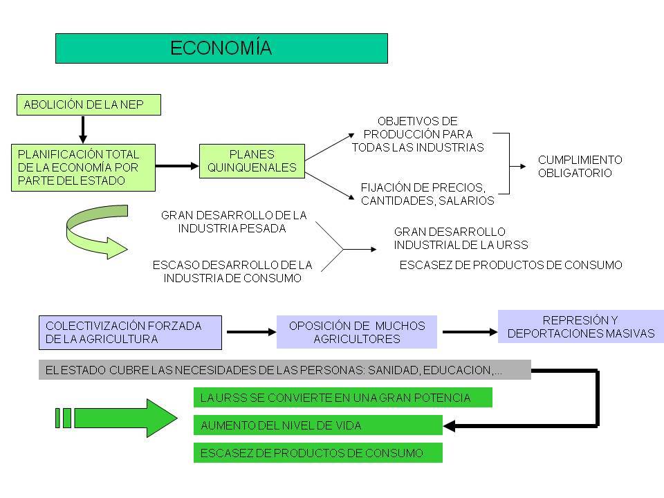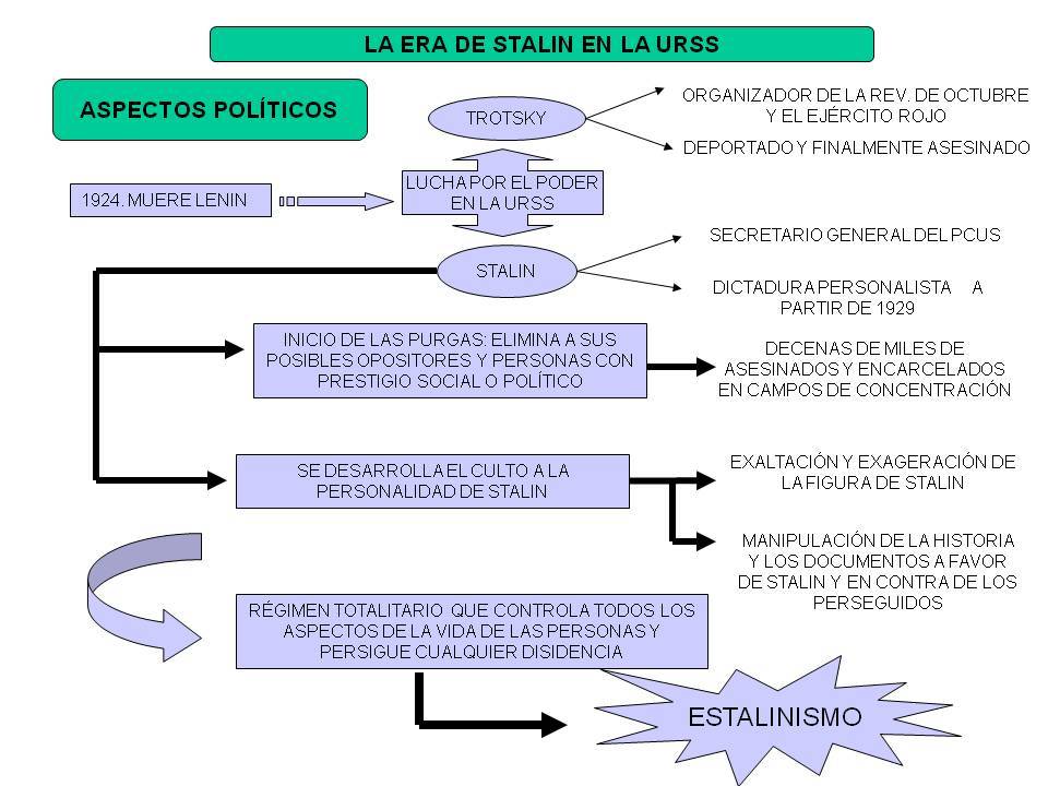 EL ASCENSO DE LOS TOTALITARISMOS Y LA SEGUNDA GUERRA MUNDIALINTRODUCCIÓNEntre 1920 y 1939 se dio una radicalización política en Europa entre el comunismo de Stalin y los totalitarismos de Italia o Alemania. Esto acrecentado por el expansionismo japonés, desencadenó una guerra mundial que produjo cincuenta millones de muertos y el intento de exterminación del pueblo judío, y mostró las posibilidades destructivas de la energía nuclear.La crisis económica de 1929 propició, sobre todo en aquellos países donde el sistema liberal-parlamentario tenía escasa tradición, la aparición de regímenes autoritarios. En la década de 1920 se instauraron dictaduras en Portugal, Rumanía, Polonia, Letonia y Yugoslavia. Esta tendencia se acentuó en los años 30, y aparecieron regímenes de este tipo en Grecia y Bulgaria. En España, un levantamiento militar de carácter fascista contra la Segunda República inició una terrible guerra civil (1936-1939) que dio paso a la instauración de la dictadura franquista.Mientras, las democracias contemplaban con impotencia el ascenso de las formas autoritarias, especialmente el agresivo expansionismo del fascismo italiano y el de la Alemania nazi. Preocupadas por sus propios problemas económicos y por la crisis social desencadenada, Francia y, sobre todo, Gran Bretaña se colocaron a la >. Toleraron las agresiones contra pequeños países y hasta en algún caso vieron el ascenso de las dictaduras como un > frente al peligro comunista. ESTALINISMOCuando Lenin enferma en 1922 se abre la pugna por el control de la URSS. Los principales candidatos tenían opciones distintas:- Por un lado, Trotsky concebía la revolución como un proceso internacional. Sostenía una visión descentralizada del partido el Gobierno.- Por otra parte, Stalin era partidario del socialismo en un solo país, de fortalecer la revolución en Rusia del partido del Estado. Con una visión política basada en la centralización.Stalin se alió con la vieja guardia bolchevique y en 1927 se hizo con el control del partido. Trotsky tuvo que exiliarse y en 1940 fue asesinado por orden del propio Stalin.Durante su largo mandato estableció un gobierno dictatorial, conocido como estalinismo, que representa los rasgos más autoritarios del comunismo soviético. La Dictadura de Stalin (Estalinismo)Stalin impuso un creciente control sobre la Unión Soviética y estableció una auténtica dictadura personal que convirtió al régimen en un Estado totalitario. Se caracterizó por los siguientes rasgos:- Culto a la personalidad: su figura fue exaltada a través de la propaganda oficial.- Control sobre el Estado y el PCUS: se crea un aparato burocrático al servicio del poder central. Por ejemplo la cultura y el arte quedan al servicio político, que incluso se difundió un estilo llamado >, que ensalzaba los logros del sistema.- Represión de todo tipo de oposición: se estableció una policía política (NKVD) que persigue la disidencia. Disidentes políticos o cualquier miembro de un partido que pudiera ser considerado rival de Stalin, intelectuales, minorías étnicas o campesinos que se negaran a la colectivización sufrieron represión, persecución o eran llevados a los campos de trabajo (gulags), éstos simbolizan el período de represión.En el plano económico se implantó una economía colectivizada y sometida al control estatal. Sus bases fueron:- Colectivización de la tierra: se prohibió la propiedad privada y la agricultura fue colectivizada a través de cooperativas (koljós) y explotaciones estatales (sovjós).- Industrialización acelarada: se puso en marcha un proceso de expansión de la industria, con el que se lograron impresionantes niveles de producción y construcción de infraestructuras.- Planificación centralizada: el Estado tomaba las decisiones económicas y establecía planes quinquenales para convertir a la Unión Soviética en una gran potencia industrial.De este modo la crisis de 1929 no afectó a la URSS, ya que estaba alejada de los círculos financieros capitalistas.