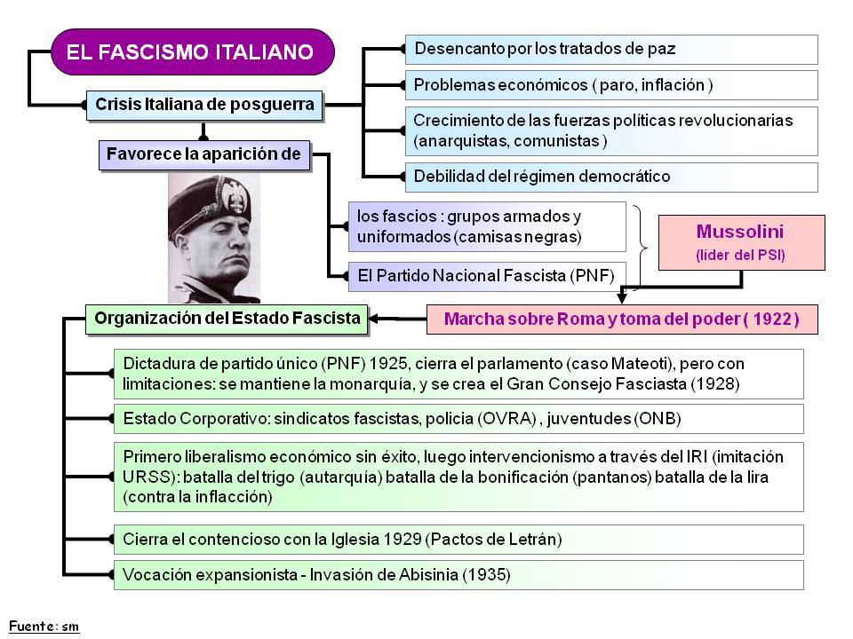 3. FASCISMO ITALIANO1. LA TOMA DEL PODER La Italia de posguerra se vio afectada por una grave crisis. - Descontento por los acuerdos de paz. Italia se sintió maltratada al no lograr sus aspiraciones territoriales. - Crisis económica. La guerra había provocado un grave endeudamiento. - Crisis social. Los problemas económicos alimentaban la conflictividad social. Las huelgas eran frecuentes, y la clase media temía el triunfo de una revolución obrera. Ante esta situación, Mussolini creó los fascios de combate en 1919, grupos ultranacionalistas y anticomunistas, y en 1921 fundó el Partido Nacional Fascista. Su actitud contra las organizaciones de izquierdas le permitió aumentar su popularidad, hasta que en 1922 organizó la Marcha sobre Roma, una demostración de fuerza que provocó que el rey le nombrase jefe de Gobierno. 2. LA DICTADURA FASCISTA ITALIANA Tras las elecciones de 1924, Mussolini instauró una dictadura de corte fascista: - Ámbito político. Persiguió a la oposición, como ocurrió con el asesinato del socialista Mateotti o el encarcelamiento del comunista Gramsci.En 1925 clausuró el Parlamento, organizó un sistema de gobierno basado en el partido único y adoptó el título de Duce. - Ámbito social. Se ilegalizaron los sindicatos, sustituidos por un modelo corporativista. Además, se controlaron los medios de comunicación y la educación, que quedaron al servicio del régimen fascista. - Ámbito económico. Se aplicó una política autárquica y se estimuló la industria desde una política de construcción de obras públicas y rearme.