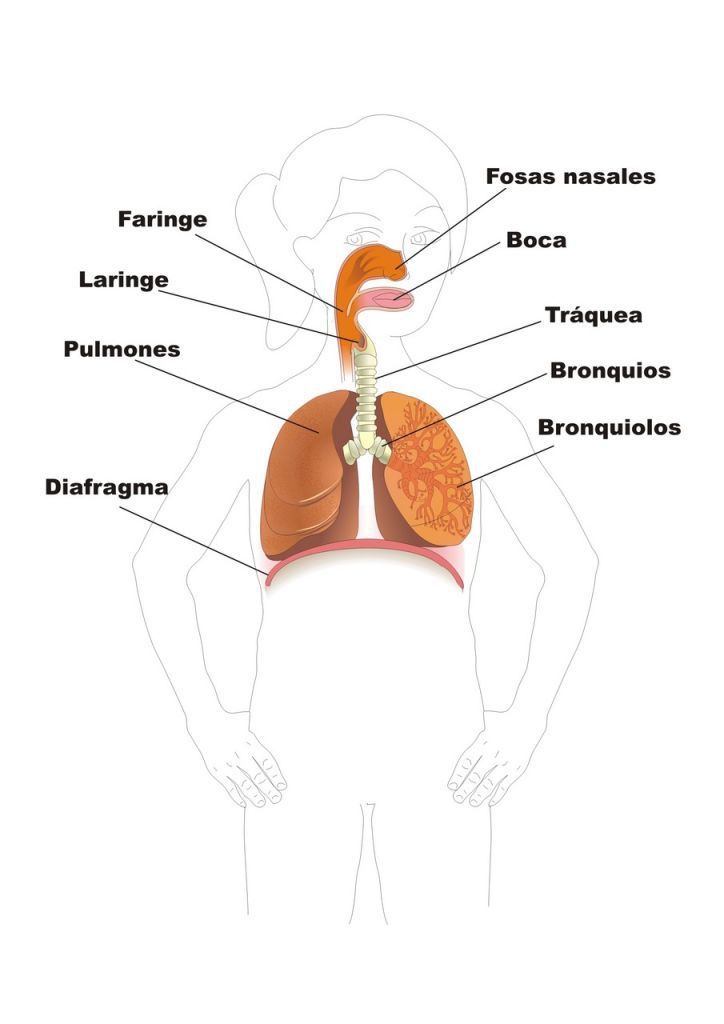 ANATOMIA Y FISIOLOGIA DEL APARATO RESPIRATORIOLas vías respiratorias son tubos que llevan el aire rico en oxígeno a los pulmones. También transportan el dióxido de carbono, un gas de desecho, fuera de los pulmones. Las vías respiratorias están compuestas por diferentes partes:Se divide en 2: Vías respiratorias superiores: que conducen a los pulmones. Fosas nasales Faringe Laringe Tráquea Bronquios Primarios Vías respiratorias Inferiores: Pulmones Bronquios secundarios y terciarios Bronquiolos Conductos alveolares y alveolos. El aire entra en tu cuerpo primeramente a través de tu nariz o boca, que calientan y humedecen el aire. Después el aire viaja por tu laringe y baja por tu tráquea. La tráquea se divide en dos tubos bronquiales que entran en tus pulmones.Una delgada solapa de tejido llamada epiglotis cubre tu tráquea cuando tragas. Esto previene que la comida y la bebida entren en las vías respiratorias que conducen hasta los pulmones.Nariz: La parte externa de la nariz es una estructura osteocartilaginosa su parte interna es una gran cavidad cubierta de epitelio y en su interior hay pelos que ayudan a evitar la entrada a sustancias extrañas.La nariz esta adaptada para el calentamiento, la humedificación y la filtración del aire así como para la olfación. Faringe: La faringe o garganta es un tubo de 12 cm esta situada en la parte posterior de la cavidad nasal, de la boca y parte de la laringe y por delante las vertebras cervicales. La faringe esta dividida en tres partes: Nasofaringe: es la parte de la faringe situada detrás de la nariz. Orofaringe: está situada detrás de la boca debajo del nivel del paladar blando. Laringofaringe: es la porción inferior de la faringe y esta situada detrás de la laringe continua en el esófago por la parte posterior, y con la laringe por la parte anterior. Laringe: es una vía corta que permite el paso del aire desde la faringe a las traquea y controla las salida de aire de los pulmones para la producción del sonido (la voz). Tráquea: Es un tubo de 12 Cm formado por anillos cartilaginosos que conecta a la laringe con los bronquios primarios . La traquea está forrada con epitelio ciliado que contiene células caliciformes que secretan moco. los cilios barren el moco y las partículas extrañas que hayan podido llegar hasta allí, hacia la laringe.Bronquios: Los bronquios primarios se dirigen respectivamente hacia los pulmones Derecho e Izquierdo y al igual que la tráquea tienen anillos cartilaginosos incompletos recubiertos por un epitelio ciliado y secretor de moco. VÍAS INFERIORES: Pulmones: son un par de órganos en forma cónica y están separados por el mediastino y cada pulmón está dividido por un surco o cisuras, en una serie de lóbulos el pulmón derecho tiene 3 lóbulos: superior, medio, inferior, y el izquierdo dos: superior e inferior. la parte superior del pulmón se llama vértice y la parte inferior se llama base, en la cara media de cada pulmón hay un orificio llamado hilio por donde penetran los bronquios arterias y venas pulmonares correspondientes. Los pulmones están cubiertos por una membrana llamada pleura pulmonar que esta formada por 2 capas una visceral y otra parietal. la visceral esta íntimamente unida ala pared del pulmón y envuelve completamente al pulmón excepto al hilio, Mientras que la parietal esta adherida alas paredes del tórax. Entre ambas capas existe una pequeña cavidad (cavidad pleural), llena de líquido pleural que facilita el movimiento de los pulmones en la respiración, dentro de esta cavidad existe una presión llamada presión intapleural que es negativa que es más baja que la presión atmosférica. una vez que entran en los pulmones, los bronquios primarios se dividen en: Bronquios secundarios: uno para cada uno de los lóbulos que tienen los pulmones. Bronquios terciarios: cada bronquio secundario se divide en dos o cuatro bronquios segmentarios para cada segmento pulmonar. Alveolos: existen alrededor de 14 millones de conductos alveolares y 300 millones de alveolos en los pulmones, es donde tiene lugar el intercambio gaseoso La pared alveolar está formada por una capa de células epiteliales que se llaman neumocitos y existen 2 tipos: Neumocitos tipo 1: son muy aplanados para facilitar el intercambio gaseoso y son los más numerosos. Neumocitos tipo 2: son mucho más escasos y son células cubicas que secretan una mezcla de fosfolípidos que recibe el nombre de surfactante pulmonar que forma una fina película en la superficie interna del alveolo, que disminuye mucho la tensión superficial de esta zona. esto es vital para evitar el colapso de los alveolos y también secretan elastina y colágeno. Existen otro tipo de células libres en la luz alveolar que son los macrófagos alveolares que son células fagocitarías cuya misión es la de mantener los alveolos libres de partículas extrañas. INERVACIÓN DEL SISTEMA RESPIRATORIO: Los músculos de la respiración son músculos esqueléticos y reciben por lo tanto inervación somática. El diafragma: recibe inervación motora de los nervios frénicos, procedentes de los segmentos medulares cervicales C3-C5. Los músculos intercostales: reciben inervación motora a través de los nervios intercostales, procedentes de los segmentos dorsales medulares. Los pulmones: reciben inervación parasimpática del nervio vago y simpática procedente de los segmentos dorsales superiores. mientras que la inervación sensitiva de los pulmones procede de la via aferente del nervio vago. Mecanismo de la entrada y paso del aire alas vías respiratorias: El aire ingresa del exterior al interior de las vías respiratorias mediante la inspiración donde pasa el aire por las narinas (derecha e izquierda). Que comunican ala cavidad nasal ( fosa nasal D. y fosa nasal I.) que llevaran el aire alas coanas. A su vez las coanas comunican con la Nasofaringe que llevara el aire ala Orofaringe. El aire pasa de la Orofaringe hacia la Laringofaringe 