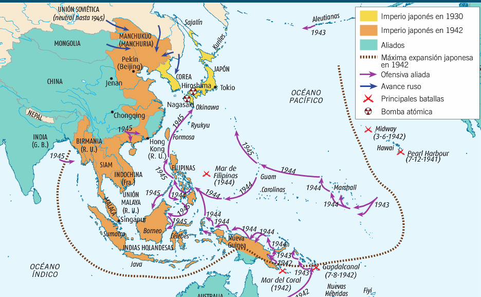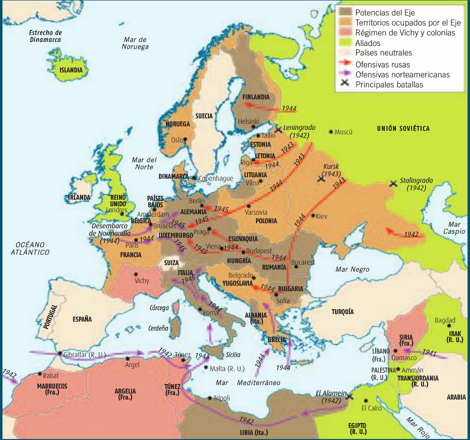 6. LA SEGUNDA GUERRA MUNDIAL (1939-1945)1. LA OFENSIVA DEL EJE (1939-1942)Los primeros años de la guerra se caracterizaron por el avance imparable de las potencias del Eje, gracias a la superioridad táctica y armamentística de sus ejércitos. Tras la ocupación de Polonia, Alemania invadió Dinamarca, Noruega, Países Bajos, Bélgica y Francia, que quedó dividida en una zona ocupada por los alemanes y en la.Francia de Vichy, donde se formó un Gobierno títere dirigido por el mariscal Petain. En Reino Unido, el primer ministro Winston Churchill organizó la defensa de la isla, mientras el general francés De Gaulle lideró desde Londres la resistencia anti-nazi en Francia. En 1941, Alemania ocupó Yugoslavia y Grecia, así como el norte de África. Además, en junio invadió la URSS. En el Pacífico, Japón se lanzó a la conquista de Asia e Indonesia. En diciembre de 1941 atacó la base naval estadounidense de Pearl Harbour, provocando la entrada en la guerra de Estados Unidos.2. EL TRIUNFO DE LOS ALIADOSEn el año 1942, los aliados tomaron la iniciativa. Estados Unidos derrotó a los japoneses en el océano Pacífico, y los británicos y rusos a los alemanes en el norte de África y en Stalingrado, respectivamente. En el año 1943, los aliados ocuparon Sicilia y liberaron Italia, mientras en el océano Pacífico los Estados Unidos continuaron reconquistando territorios. En 1944, desembarcaron en Normandía (Francia) y avanzaron hacia la frontera alemana. Paralelamente, los soviéticos prosiguieron la liberación de la Europa oriental, hasta que en mayo de 1945 Alemania se rindió. En el Pacífico, Japón ofreció una tenaz resistencia, y el presidente Harry Truman decidió lanzar bombas atómicas sobre Hiroshima y Nagasaki.