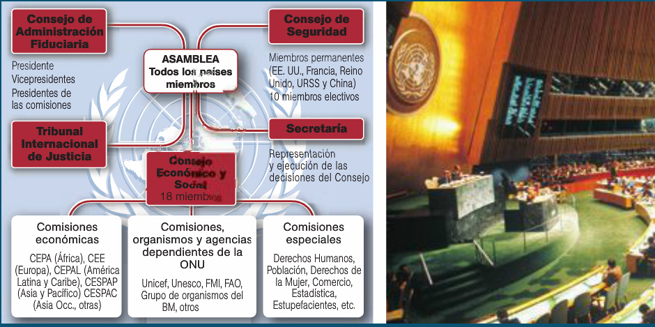 7. LAS CONSECUENCIAS DE LA GUERRA1. LA DESTRUCCIÓN BÉLICALa Segunda Guerra Mundial tuvo los efectos más destructivos conocidos hasta hoy: - Pérdidas demográficas: Murieron alrededor de 54 millones de personas, la mayor parte de ellas civiles. - Pérdidas materiales: Muchas ciudades, así como vías de comunicación e infraestructuras, fueron arrasadas. - Cambios territoriales: Alemania perdió territorios en el este, que pasaron a Polonia y Rusia, y fue ocupada por los vencedores. Italia cedió territorios a Yugoslavia y Grecia en el Adriático y el Egeo, respectivamente. Por su parte, Japón fue ocupado por Estados Unidos. - Trauma moral: El número de víctimas, los desplazamientos, la destrucción, etc., provocaron un gran impacto psicológico. 2. LA ORGANIZACIÓN DE LA PAZ Durante la guerra, los aliados celebraron conferencias de paz para organizar el mundo de posguerra. En Teherán (1943), Yalta (1945) y Potsdam (1945) los aliados coordinaron sus esfuerzos bélicos y decidieron repartir Austria, Alemania y Berlín en cuatro zonas de influencia. Además, se acordó la celebración del proceso de Nuremberg, en el que se juzgó a los líderes nazis por haber cometido crímenes contra la humanidad. Progresivamente, el clima de entendimiento entre los aliados fue sustituido por una nueva rivalidad entre Estados Unidos y la Unión Soviética, las dos nuevas superpotencias. Era el origen de la guerra fría. 3. EL NUEVO ORDEN ECONÓMICO Las potencias vencedoras diseñaron la organización económica del mundo en la Conferencia de Bretton Woods (1944). El nuevo modelo se fundamentó en dos instituciones: el Fondo Monetario Internacional (FMI) y el Banco Mundial (BM). Además, se reconoció el patrón oro y se aceptó el dólar como moneda de referencia mundial. El sistema quedó completado con el GATT (Acuerdo General de Aranceles y Comercio). La URSS se mantuvo al margen de todos estos acuerdos. 4. LA CREACIÓN DE LA ONU En la Conferencia de San Francisco (1945) se fundó la Organización de Naciones Unidas (ONU). Los objetivos de la ONU eran: - El mantenimiento de la paz. - La resolución de conflictos. - El respeto a los derechos humanos. - El fomento de la cooperación internacional. La ONU quedó estructurada en los siguientes organismos: - La Asamblea Nacional, formada por todos los Estados miembros. - El Consejo de Seguridad, compuesto por quince miembros, cinco de ellos permanentes (Estados Unidos, URSS, Francia, Reino Unido y China). - La Secretaría General, cargo unipersonal dedicado a impulsar iniciativas y gestionar la diplomacia.