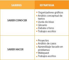 Los saberes asociados al ser y convivir se promueven desde cada una de las actividades que el tutor proponga y no requieren estar sujetos a una u otra estrategia de las antes presentadas, ya que son transversales al proceso de formación.Se describe a continuación cada una de las estrategias relacionadas en la tabla anterior:Organizadores Gráficos: (Softares como Edraw, Power Point, entre otros) Comprende el conjunto de representaciones grácas que se pueden utilizar para expresar la relación conceptual sobre un contenido o tema. Algunos de estos organizadores son: mapas conceptuales, mapas mentales, diagramas de flujo, árbol de ideas, diagramas de llaves, etc. Esta estrategia es ideal para cuando se desea promover conocimientos de tipo conceptual y puede ser usada tanto por el tutor para presentar un tema, como por el estudiante para dar a conocer la comprensión que ha hecho de un tema en estudio.Análisis conceptual de textos: Con base en una una guía de análisis, el estudiante luego de realizar la lectura de uno o más textos, rescata conceptos claves de los mismos que le permitan comprender las ideas centrales que plantea el autor, así como la intencionalidad del mismo. En una guía de análisis conceptual, es importante que se tengan en cuenta los siguientes ítems: identicación del texto (título, autor, año de publicación), conceptos claves, relación entre los conceptos claves (se puede hacer a través de un mapa conceptual), definiciones de los conceptos, frases relevantes, idea central del texto (expresadas de forma breve en sus propias palabras) y bibliografía consultada. Esta estrategia es de gran utilidad cuando se desea que el estudiante afiance conocimientos de tipo conceptual.Aprendizaje basado en proyectos: Consiste en solicitar a los estudiantes el desarrollo de una idea o producto, a través de los cuales se puedan poner en práctica los conocimientos propuestos para el curso/módulo. Es importante al momento de solicitar el proyecto que éste sea contextualizado, que responda al interés de los estudiantes y que con éste, se pueda atender a una necesidad; se requiere además, orientar al estudiante en el desarrollo del mismo, ofreciendo una guía con pasos o fases a seguir.El tutor no sólo debe evaluar el producto final sino todo el proceso que los estudiantes siguen en su desarrollo, así como la participación de los diferentes integrantes del grupo. Con el desarrollo de esta estrategia se promueve el desarrollo de conocimientos procedimentales y con ello el desarrollo de competencias de saber conocer y saber hacer. Análisis de casos: Consiste en el análisis de situaciones problemáticas reales que deben ser resueltas con la finalidad de que los estudiantes reflexionen respecto a un tema (Díaz Barriga, 2005). Los análisis de casos son de gran utilidad para promover discusiones en las cuales se establezca relación entre la vida real y las teorías o principios estudiados. Se contribuye al pensamiento crítico y en éstas es de gran importancia el saber ser, promoviendo el desarrollo integral de los estudiantes.En el desarrollo de esta actividad es de gran importancia el uso de espacios de socialización ya sean sincrónicos o asincrónicos a través de los cuales se puedan compartir las reflexiones del grupo.Aprendizaje basado en problemas Se trata del planteamiento de un problema el cual requiere del esfuerzo por parte de los estudiantes para su solución. Se recomienda que para su desarrollo se organicen grupos, donde los miembros aprovechen sus habilidades y desarrollen aprendizaje y trabajo colaborativo. Es necesario que el tutor facilite fuentes de información y los recursos que sean necesarios; además, disponga de espacios para la asesoría y orientación en el proceso de solución del problema.El ABP, es oportuno usarlo en módulo/curso cuyo objetivo es el aprendizaje práctico, ya que promueve el pensamiento creativo y divergente. Espacios de construcción colectiva como las wikis, son de mucha utilidad cuando se aplica esta estrategia al permitir la construcción a varias manos, así como el seguimiento al desarrollo de la actividad por parte del tutor.Lluvia de Ideas: Consiste en la proposición de ideas alrededor de un tema por parte de los integrantes del curso/módulo. Para su desarrollo se pueden tener en cuenta algunas preguntas motivadoras. Esta estrategia es ideal para explorar los conocimientos previos acerca de un nuevo tema o para compartir ideas alrededor de uno estudiado. La lluvia de ideas es ideal al inicio de una unidad, una sesión, un tema o para dar lugar a un proyecto.Para el desarrollo de la lluvia de ideas es necesario el uso de espacios de participación sincrónica o asincrónica mediante los cuales el estudiante pueda compartir sus ideas. El muro digital resulta de gran utilidad para el desarrollo de esta estrategia ya que el estudiante puede expresarse combinando imágenes, videos, audios y texto para presentar el conocimiento que tiene de un tema.. Se pueden usar herramientas de la web donde el estudiante a modo de post-it puede colgar en el muro sus apuntes.Debate o foro : Consiste en la discusión formal sobre un tema, en el que se requiere la figura de un moderador, el cual puede ser el tutor o un estudiante. Los foros pueden llevarse a cabo a partir de preguntas orientadoras o planteamientos o previa consulta de un material (lecturas, videos, caso) de tal forma que los participantes aporten a la discusión y se permita la construcción colectiva. El moderador del foro guía la discusión y hace el cierre del mismo.Esta actividad puede desarrollarse con todos los estudiantes del grupo o dividiendo en subgrupos a los estudiantes, de acuerdo con el propósito de la actividad , utilizando en ambos casos herramientas de comunicación asincrónica. Los foros son ideales para el desarrollo del pensamiento crítico y el aprendizaje colaborativo.Glosario: Comprende un conjunto de términos definidos sobre un tema, q