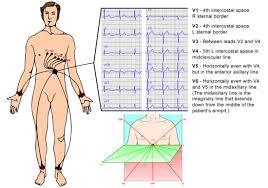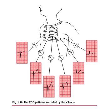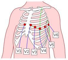 Se colocan los electrodos en forma de “horizontal” en el tórax de puntos específicos, tales son: *V1: sobre la línea paraesternal derecha a nivel del 4º espacio intercostal *V2: línea paraesternal izquierda sobre el 4º espacio intercostal *V3: entre V2 y V4 *V4: en la línea medioclavicular, 5º espacio intercostal. En H por debajo de la tetilla, y en la M por debajo de la glándula mamaria. *V5: en línea axilar anterior, 5º espacio intercostal *V6: en línea axilar media, 50 espacio intercostal. En caso de una dextrocardia, se pueden usar los electrodos en parte derecha del tórax (V3r – V6r)