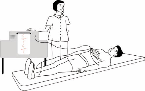 Para registrar se colocan 4 cables en las extremidades del paciente, las cuales se llamaran derivaciones del “plano frontal”; y otros 6 cables en la cara anterior del tórax , obteniendo derivaciones del "plano horizontal o precordiales."