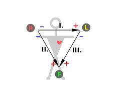 Derivaciones bipolares *Derivación I: va del brazo derecho al brazo izquierdo, con una carga de – a + respectivamente. *Derivación II: va del brazo derecho al pie izquierdo, de – a +. *Derivación III: va del brazo izquierdo al pie izquierdo, de – a +. Pensando en que la fuente de actividad eléctrica del cuerpo se localiza en centro del mismo (corazón), Einthoven unió las 3 derivaciones formando una triángulo equilátero; y realizo una ley: DII = DI + DIII