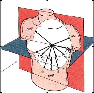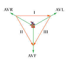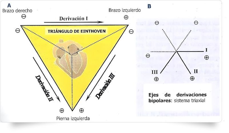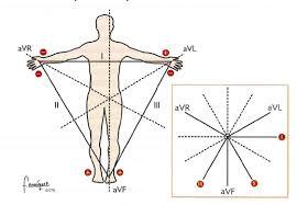 Einthoven , para registrar potenciales eléctricos en el plano frontal, eligió derivaciones bipolares. Los electrodos se colocan en el brazo derecho (aVR), brazo izquierdo (aVL), pie izquierdo (aVF) y existe uno para el pie derecho que funciona como “tierra” y no tiene gráfico electrocardiográfico.