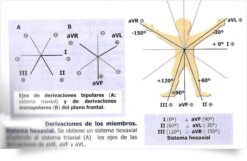 Las derivaciones bipolares y monopolares tiene una relación matemática en el plano frontal, de manera tal que se puede formar un sistema de referencia hexaxial, teniendo cada derivación una parte + y otra -; y el límite entre las dos partes corresponde al centro del eje de la derivación que coincide con el centro eléctrico del corazón.