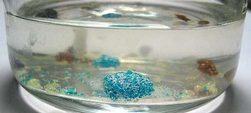 Jardín cristalino:50 mL H2O CuSO4 NaSO4+CuSiO3 50mL Na2SiO3 FeSO4 NaSO4+FeSiO3 MnCl2 + Na2SiO3 NaCl +MnSiO3 CoCL2 NaCl +CoSiO3 MgCl2 NaCl +MgSiO3 FeCl2 NaCl +FeSiO3Se crean columnas huecas de la parte insoluble.