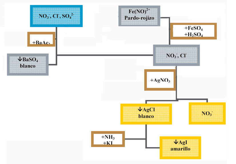 El Análisis Cualitativo es la parte de la Química Analítica que tiene por objeto el reconocimiento o identificación de los grupos químicos presentes en una muestra. Cuando se trata de muestras inorgánicas, el análisis implica a los constituyentes metálicos (cationes) y a los no metálicos (aniones). Como la mayor parte de las sales inorgánicas al disolverse liberan iones, éstos pueden reconocerse haciendo uso de propiedades observables características, como puede ser el presentar cierto color o formar algún precipitado con determinado reactivo. La propiedad observada puede ser únicamente característica del grupo químico que la presenta, en cuyo caso se denomina ESPECIFICA (o producida por un reactivo específico). Si la mencionada propiedad común, en igualdad de condiciones, es a varios grupos químicos recibe el nombre de GENERAL, y se denomina SELECTIVA cuando la presentan un conjunto más limitado de ellos.Cuando coexisten varios cationes o aniones en disolución el problema de su reconocimiento puede ser complicado, ya que pueden presentarse INTERFERENCIAS mutuas que oscurecen o anulan la acción de los reactivos. En estas ocasiones suele recurrirse a la utilización de marchas sistemáticas. Identificación de Cl-Cl- + Ag+ ----> AgClSe añade HNO3 y AgNO3 a una disolucion de Cl- -------------> Precipitado blanco que oscurece a la luz = presencia de cloroIdentificación de SO4 (-2)SO4 (-2) + Ba (+2)-----> BaSO4Se añade a una disoluicón de SO4 (-2) HCl y Acetato de Bario ------------->Precipitado blanco= presencia de sulfato.Identificación de NO3-NO + Fe(+2)------> Fe(NO)(+2)Se añade a una disolución de NO3- FeSO4 y H2SO4-----------> Color pardo = presencia de nitrato.