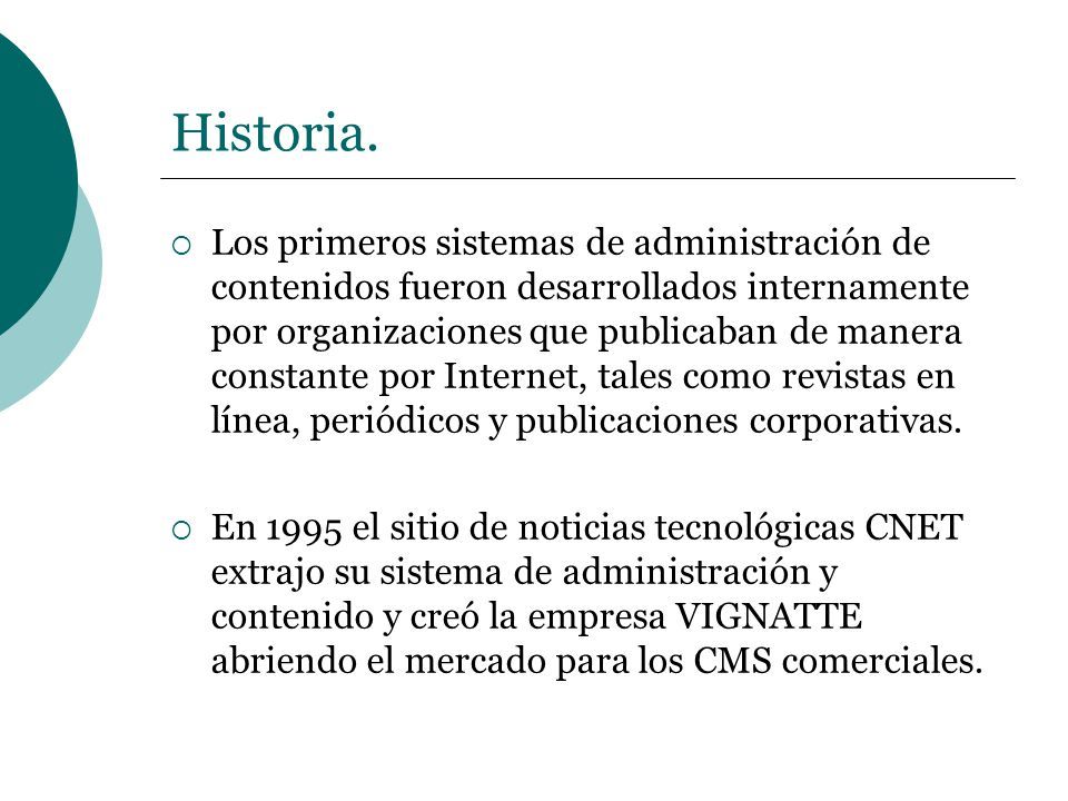 ¿origen de los sistemas de gestión del conocimiento?El gestor de contenido es una aplicación informática usada para crear, editar, gestionar y publicar contenido digital multimedia en diversos formatos. El gestor de contenidos genera páginas web dinámicas interactuando con el servidor web para generar la página web bajo petición del usuario, con el formato predefinido y el contenido extraído de la base de datos del servidor.Esto permite gestionar, bajo un formato estandarizado, la información del servidor, reduciendo el tamaño de las páginas para descarga y reduciendo el costo de gestión del portal con respecto a un sitio web estático, en el que cada cambio de diseño debe ser realizado en todas las páginas web, de la misma forma que cada vez que se agrega contenido tiene que maquetarse una nueva página HTML y subirla al servidor web.En 1995, el sitio de noticias tecnológicas CNET sacó su sistema de administración de documentos y publicación y creó una compañía llamada Vignette, pionero de los sistemas de administración de contenido comerciales.Los primeros sistemas de administración de contenidos fueron desarrollados por organizaciones que publicaban una gran cantidad de contenido en Internet, y necesitaban de continuas actualizaciones; como revistas en línea, periódicos y publicaciones corporativas.