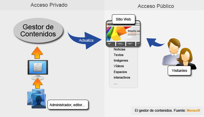 Funciones de los sistemas de gestión de contenidos.Los gestores de contenidos funcionan gracias a que estas plataformas funcionan por medio un interfaz con la cual controlan bases de datos donde se aloja el mismo sitio web o espacio en la red. Permite de esta forma crear y administrar los contenidos. Estas plataformas ofrecen al público o usuario diferentes opciones de uso como por ejemplo editar, administrar o controlar. Según sea el caso y la necesidad que se presente dentro de la producción de contenidos que se vayan creando a medida que se va utilizando.El gestor de contenidos facilita el acceso a la publicación de contenidos a un rango mayor de usuarios. Permite que sin conocimientos de programación ni maquetación cualquier usuario pueda añadir contenido en el portal web.Además permite la gestión dinámica de usuarios y permisos, la colaboración de varios usuarios en el mismo trabajo, la interacción mediante herramientas de comunicación.Los costes de gestión de la información son mucho menores ya que se elimina un eslabón de la cadena de publicación, el maquetador. La maquetación es hecha al inicio del proceso de implantación del gestor de contenidos. La actualización, backup y reestructuración del portal son mucho más sencillas al tener todos los datos vitales del portal, los contenidos, en una base de datos estructurada en el servidor. Entre las funciones de un gestor de contenidos están conceder permisos en un servidor de informes en modo nativo; crear y administrar asignaciones de funciones; tareas de nivel de elemento; usar las funciones predefinidas. El gestor de contenidos garantiza independencia y desarrollo en un proyecto. SQL, es decir, Server Reporting Services, usa autorización basada en funciones y, a la vez, un subsistema autentificativo de operaciones y accesos. Los gestores de contenidos son sistemas como Alfresco, sistemas web, software para web que rentabilizan trabajo. FUNCIONES DE EDICIÓN DE CONTENIDOS Creación de contenidos Gestión de contenidos Publicación de contenidos Presentación de contenidos FUNCIONES DE EXPLOTACIÓN DE LA WEB Entornos colaborativos Perfiles de usuarios Sindicación de contenidos Articulación de funcionalidades Integración de aplicaciones