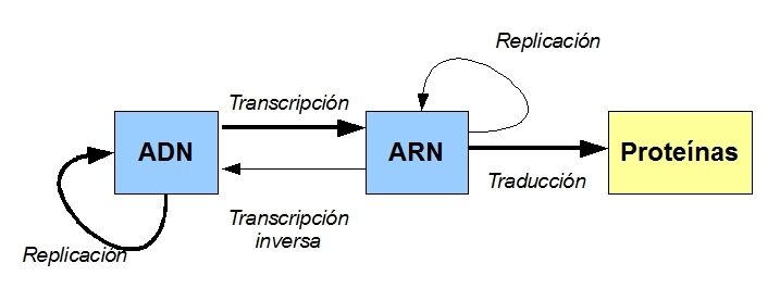 Sway: https://goo.gl/LndNGuEn 1994 Avery y sus colaboradores determinaron que la información hereditaria se encontraba en el ADN. Sin embargo el ADN se encuentra en el núcleo de las células eucariotas y la síntesis de proteínas se lleva a cabo en los ribosomas del citoplasma y en los adosados al RE, por lo que de alguna manera se necesita que la información fluya del núcleo al citoplasma a través de una molécula intermediaria. Esta molécula es un ARN llamado mensajero que mediante el proceso de TRANSCRIPCIÓN lleva la información del núcleo la citoplasma. Por otro lado la información genética pasa de una generación celular a otra, y también de un individuo a su descendencia, gracias a la REPLICACIÓN previa del ADN. A este proceso se le denomina FLUJO DE LA INFORMACIÓN GENÉTICA. Todo este trasvase de información se produce gracias a la complementariedad de las bases nitrogendas que puede generar copias de ADN y trasvase de información al ARN. Hoy se sabe que este flujo de información puede producirse de manera retrógrada. Algunos virus que almacenan su información en forma de ARN poseen un enzima, la transcriptasa inversa o retrotranscriptasa que es capaz de pasar la información de un ARN a un ADN También existen virus que replican su ARN en la célula que infentan gracias a ARN replicasas A continuación se explican en detalle los procesos de replicación del ADN , la transcripción y la biosíntesis de proteínas o traducción así como las características del Código Genético. ¿Cómo es la replicación del ADN? Conservativa o conservadora: si se genera una ADN de doble hebra (strand) nuevo y se conserva íntegramente el parental (template strand) . Dispersante o dispersiva: cada ADN resultante de la duplicación contiene fragmentos del paretal y del de nueva síntesis Semiconservadora o semiconservativa: cada molécula hija de ADN contiene una hebra parental y otra de nueva síntesis.