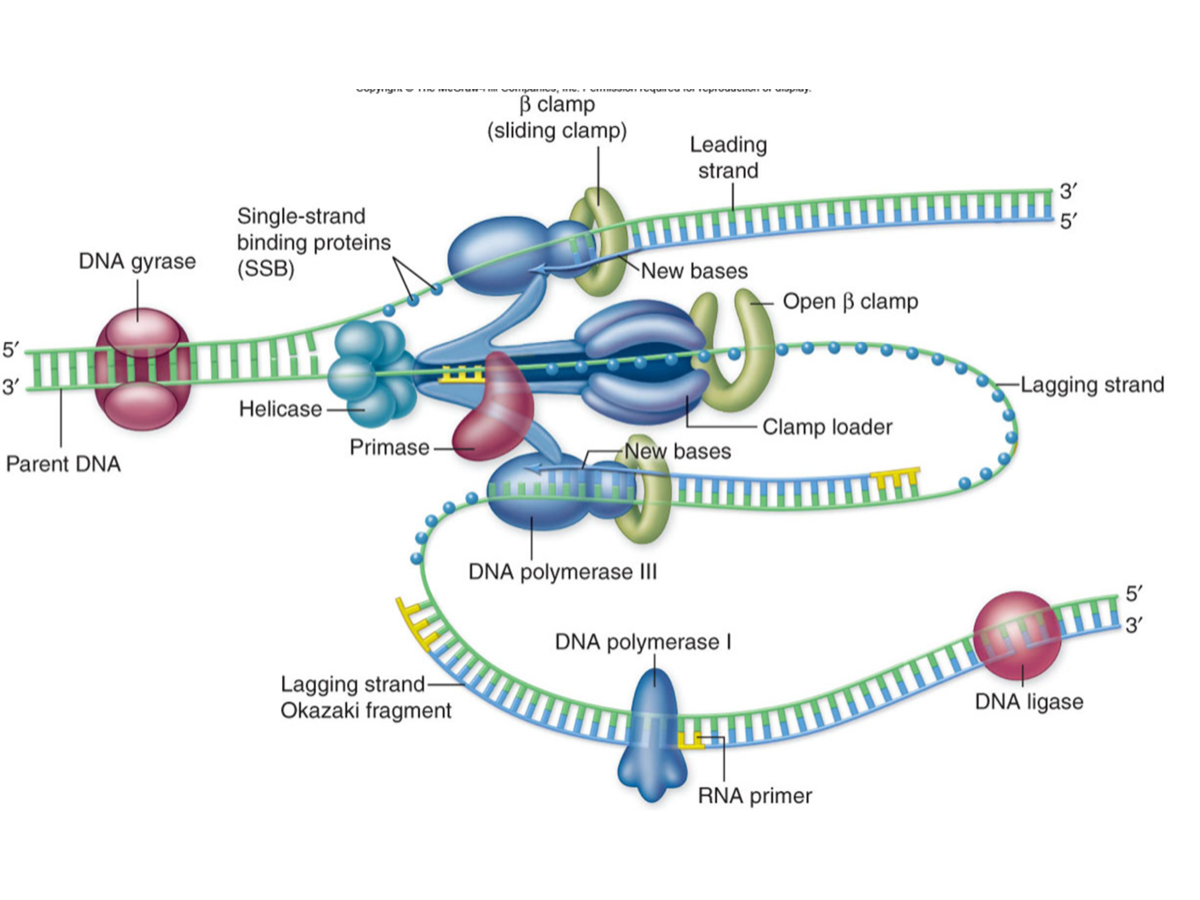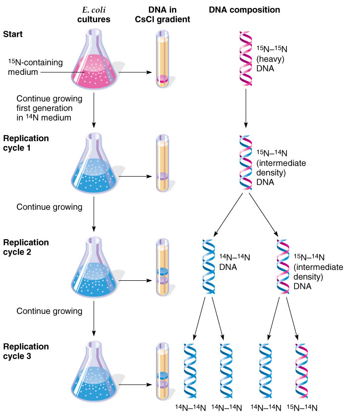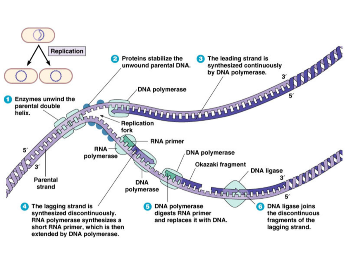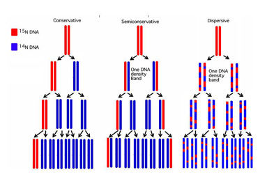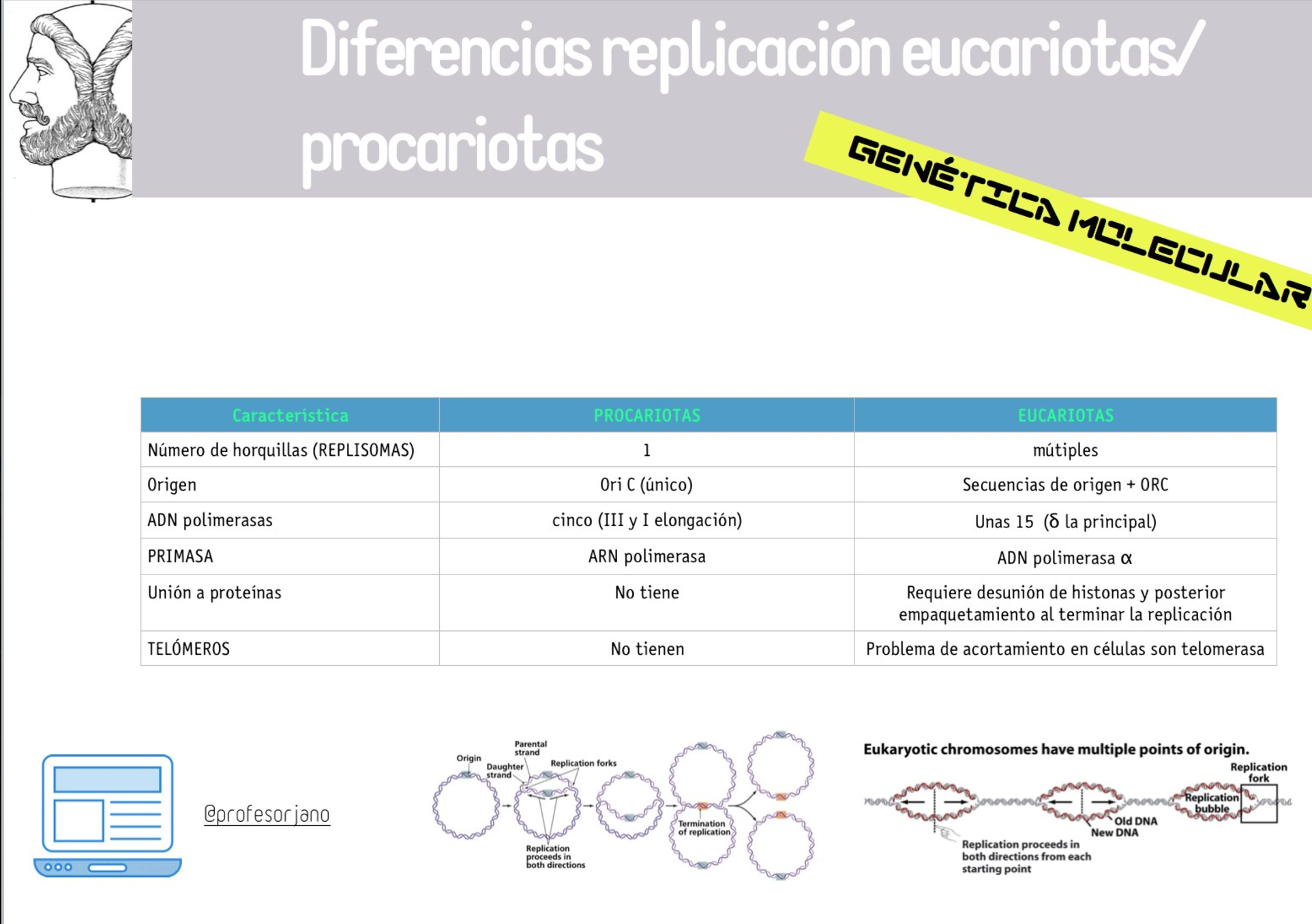Sway: https://goo.gl/LndNGuEn 1957 Meselson y Stahl realizaron un elegante experimento con el que confirmaron que el modelo válido es el SEMICONSERVATIVO. (vídeo explicativo) La replicación del ADN es diferente en eucariotas que en procariotas. Sin embargo hay características igualmente válidas para ambos que conviene tener claro. La replicación no comienza al azar sino en puntos concretos (en procariotas en un sólo punto). A cada una de estas unidades de replicación se les denomina replicones. En eucariotas cada uno de ellos comienza la replicación de manera simultánea. Como consecuencia las dos nuevas hebras se van alargando progresivamente por adición secuencial de desoxirribonucleótidos. En cada punto de inicio de la replicación se rompren los puentes de hidrógeno de la doble hélice y se genera una burbuja (bubble) de replicación con dos horquillas (fork). Las ADN polimerasas que intervienen en la replicación tienen dos limitaciones”: No pueden uir dos nucléotidos entre libres entre sí, sólo añadirlos a una cadena (por eso necesitan una cadena previa llamada cebadaor que es un ARN) La dirección en la que pueden unir desoxirribonucleótidos es 5’--> 3’ La maquinaria enzimática, procesos de iniciación y estabilización del ADN que se duplica aparte, requiere: Un cebador al que las ADN polimerasas puedan añadir los nucleótidos. Este cebador es un ARN fabricado por la ADN polimerasa a o primasa Sustratos: los cuatro dNTPs (desoxirribonucleótidos activados) Cofactores: las ADN polimerasas necesitan que los dNTPs lleven asociado el catión metálico Mg2+ (in vitro también puede ser el Mn2+) Molde o plantilla. El orden correcto de incorporación de los nucleótidos viene determinado por su complementariedad de bases con la secuencia de cada hebra de DNA, que actúa como molde o plantilla. DNA polimerasas. Son la familia de enzimas que van a unir nucleótidos en dirección 5’-->3’. En procariotas hay tres la ADNpol I, II y III, siendo las III la que realiza la priincipal tarea de replicación. En eucariotas hay cinco ADNpol principales la a, b, g, d, e, aunque hay más. La ADNpol d (la e también) es la que lleva el peso de la elongación de la cadena de ADN de nueva formación. Las ADNpolimerasas también pueden tener actividad EXOnucleasa, es decir, la de romper cadenas de nucleótidos desde los extremos.