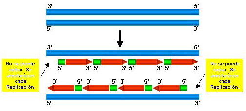 FASES DE LA REPLICACIÓN DEL ADN Sway: https://goo.gl/LndNGu INICIACIÓN En procariotas, como ya se ha dicho, la replicación comienza en un sólo lugar que están constituido en una región. En eucariotas, dada la gran longitud de sus cromosomas, la duplicación comienza en varios puntos y habrá, por lo tanto, varios replicones. La iniciación comienza con el reconocimiento del (los) punto(s) de origen. Muchos de ellos contienen una secuencia especial de nucleótidos que se ha denominado OriC. Este complejo contiene: Helicasas: son proteínas generalmente hexaméricas que se unen al ADN en el origen de la replicación y su función es romper los puentes de hidrógeno de la molécula de ADN que se va a replicar. Consume ATP en el proceso Proteínas de unión a hebra sencilla o SSB. Impiden que los puentes de hidrógeno se vuelvan a formar. Topoisomerasas: al separarse las hebras del ADN se genera tensión en los extremos de la burbuja que aún no se han abierto (imagina lo que pasa cuando quieres desenrrollar las “cuerditas” que forman una cuerda) debido al súperenrrollamiento que se produce. Las toposiomerasas alivian esta tensión. También actúan durante el sobrecruzamiento del paquiteno de la meiosis. Primasa (o ADNpol a): fabrica el ARN cebador. Ya está formado el complejo de inicio y la burbuja con sus dos horquillas abierta. Ahora entrarán en acción las ADNpolimerasas encargadas de copiar de manera complementaria cada una de las hebras parentales. ELONGACIÓN A cada complejo de inicio se le va a unir la ADNpolimerasa encargada de la elongación formándose así el replisoma. Esta ADNpolimerasa unirá los desoxirribonucléotidos a los ARNcebadores de manera complementaria a la hebra parental que sirve de molde. Sin embargo hay un problema: las cadenas de ADN son antiparalelas y las ADNpolimerasas sólo pueden unir nucleótidos en sentido 5’-->3’ y ese es sólo el sentido de avance de una de las cadenas de cada horquilla. Esta hebra se puede sintetizar de manera continua y se denomina hebra conductora, líder o guía (leading strand). Sin embargo, la otra hebra parental se encuentra en sentido 5’-->3’ por lo que la síntesis de su complementaria sería en sentido 3’-->5’, capacidad que no tiene la ADNpolimerasa como ya se ha dicho. La solución al problema de la síntesis de esta cadena se reveló al comprobar que se producía en forma de pequeños fragmentos llamados fragmentos de Okazaki (en honor a su descubridor Tuneko Okazaki). Se propuso entonces un modelo en el que la síntesis complementaria de la hebra molde que iba en sentido 5’-->3’ de cada horquilla se produciría en sentido opuesto al de avance de la horquilla y en forma discontinua. A esta hebra de nueva síntesis que se replica “a trocitos” se le denominó hebra retardada o retrasada (lagging strand). Lógicamente, la síntesis de cada fragmento de Okazaki requiere su propio ARN cebador. Para que esto sea posible es necesario que la hebra molde en sentido 5’-->3’ forme un bucle para disponerse en sentido 3’-->5’ en el sentido de avance de la horquilla ya que es una misma ADNpolimerasa la que forma tanto la hebra conductora como la retardada. La elongación se producirá por la unión de los dNTPs complementarios correspondientes mediante enlace fosfodiéster. Durante el proceso de elongación también se produce una actividad exonucleasa de la ADNpol que elimina nucleótidos mal apareados así cómo los fragmentos de ARNcebador y rellenando los huecos con ADN. A continuación la ADNligasa une todos los fragmentos obtenidos. TERMINACIÓN Termina evidentemente cuando la ADNpolimerasa termina la repicación en todas las horquillas (o en todo el ADN circular en el caso de sea una célula procariota) En el caso de los eucariotas, se llega al final de la replicación al final de la molécula del ADN lineal de cada cromosoma o telómero. Cuando se elimina el último ARNcebador, la hebra retardada quedará incompleta ya que la ADN polimerasa no podrá rellenar el hueco al ser incapaz de sintetizar en direción 3’ --> 5’. Para poder completar la cadena, la polimerasa necesitará un extremo hidroxilo 3’ libre donde inicia un nuevo fragmento. Este hecho hace que el telómero se vaya acortando un poco cada vez que la célula se divide, fenómeno que se asocia a los procesos de enevejecimiento y muerte celular. Las ADNs polimerasas son muy eficientes en su proceso de replicación ya que pueden ir corrigiendo erores de eemparejamiento consiguiendo que sólo haya un error cada 100.000 bases. Además existen mecanismos de corrección de estos errores una vez terminada la replicación. ANIMACIÓN REPLICACIÓN Vídeo ADN - empaquetamiento y replicación (y tranascripción y replicación) Lección sobre la replicación