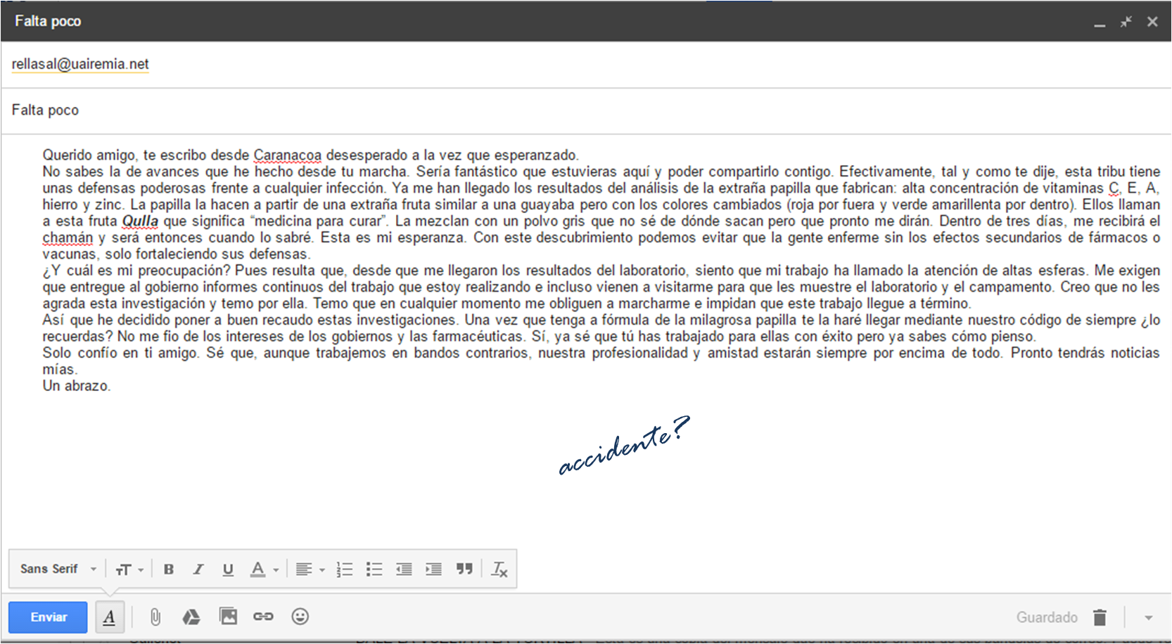 Preguntamos a su MÉDICO DE CABECERA sobre la salud del profesor y esto es lo que nos dice: Hace aproximadamente un año lo recibió por primera vez en su consulta con los siguientes síntomas: taquicardia, hipertensión, insomnio y entumecimiento en las extremidades. Tras unos análisis rutinarios que muestran normalidad, se le aconseja disminuir el ritmo de trabajo, controlar la tensión con la alimentación y pasear cada día a paso ligero una hora. A los dos meses vuelve a la consulta con deterioro de la memoria y fibromialgia. Se le diagnostica fatiga crónica. Al mes vuelve a la consulta emocionalmente destrozado, le han jubilado anticipadamente del trabajo porque su compañera ha denunciado al jefe que no tiene las facultades necesarias para continuar con su investigación. El médico le oyó decir: "Creerá esa tipeja que así va a parar la investigación". El médico le repite los análisis. Detecta disfunción renal. Lo remite al urólogo. El urólogo no llega a verlo. Preguntamos a su jefe en la Universidad y nos dice: Hace tres años pidió permiso para pasar un mes en la Amazonia con un colega suyo que llevaba entre manos una línea muy interesante de investigación, según él. Volvió de allí animado y contento y reflexionando sobre un nuevo rumbo en su trabajo. Durante meses hablaba sin parar de su amigo y de su maravilloso trabajo aunque nunca llegó a concretar de qué se trataba. El amigo muere y recibe una foto en la que aparecen juntos. Durante días se encierra en su laboratorio hasta que un día sus compañeros se asustan al escucharle reír como un loco diciendo "¿Con qué Julio César?" A la semana aproximadamente entra a trabajar la Dra Lamala. En un principio parecían llevarse bien, incluso la Dra Yosoi le aconsejó un dentista amigo suyo para unas amalgamas que necesitaba. Sin embargo, después de eso, la relación se volvió fría y distante para sorpresa de todo el departamento. Finalmente, la Dra denunció al director de personal que el profesor no estaba en condiciones de continuar su trabajo por lo que éste, antes de sufrir un largo y doloroso proceso de investigación, decidió jubilarse anticipadamente. A partir de aquí, el profesor no volvió a la universidad. Tras insistir mucho, consiguió quedar con él para tomar un café. Lo encontró muy desmejorado y preocupado. Había visitado a un especialista amigo suyo que quería hacerle pruebas porque sospechaba que tenía esclerosis múltiple. Él por el contrario decía que todo era perder el tiempo. Estaba seguro de que tenía envenenamiento crónico pero no conseguía descubrir el origen y el tipo de toxina. No conseguía que le hicieran pruebas para determinarlo ya que achacaban sus sospechas a síntomas de demencia. Habló con él una semana antes de que muriera. Estaba muy abatido. Apenas podía moverse. Se sentía muy cansado. Le dijo que sabía que le quedaba poco. Que seguiría el mismo camino que su amigo pero que no conseguirían detener lo que era justo. Su jefe reconoce que no dio mucho crédito a sus palabras.