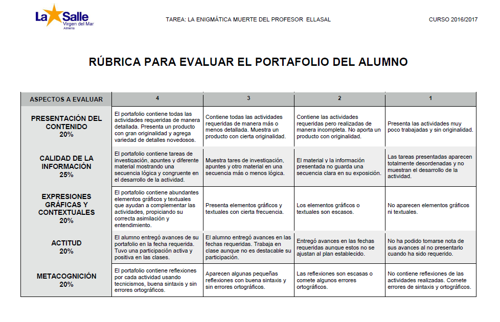 ¿Qué estaba haciendo en el momento de la muerte? INVESTIGACIÓN LLEVADA EN SU CASA Quién es el profesor Ellasal? ¿Qué trabajo llevaba a cabo en la Universidad de Airemla? ¿Cuál era su grupo de investigación? ¿amigos, enemigos...? INVESTIGACIÓN LLEVADA EN LA UNIVERSIDAD, EN SUS LUGARES DE TRABAJO Y CON SUS COLEGAS DE PROFESIÓN Y ALUMNOS. ¿Qué pensaban de él sus amigos, familia y vecinos? INVESTIGACIÓN LLEVADA EN SU BARRIO, VECINOS Y FAMILIARES ¿Que problemas de salud tenía? ¿por qué le inhabilitaron? INVESTIGACIÓN LLEVADA CON SU MÉDICO DE CABECERA Y SU JEFE EN EL DEPARTAMENTO. ¿Cuál es el informe de la autopsia? ¿concuerda con los datos recogidos? INVESTIGACIÓN LLEVADA CON EL EQUIPO DE MEDICINA FORENSE ¿CÓMO PRESENTAR TODA LA INFORMACIÓN RECOGIDA? Conforme vayas trabajando todas las actividades propuestas, deberás recoger también evidencias de cómo has pensado, analizado, interactuado con otros (compañeros, profesores y externos al colegio) durante todo el transcurso de esta tarea. Para ello debes presentar los ejercicios, notas de clase, vídeos, fotografías, tus reflexiones sobre lo que estás trabajando, las consultas que realizas, etc. En definitiva, tu portafolio debe ofrecer evidencias sobre tu proceso de aprendizaje. El formato que puedes utilizar para ello es libre. Yo te recomiendo que realices un portafolio digital. Para ello son muy útiles herramientas como GOOGLE SITES o WORDPRESS. Hay aplicaciones que te pueden resultar muy útiles para ello, sin necesidad de realizar un blog, como PADLET o GENIALLY. Puedes combinar también estas aplicaciones incrustándolas en un blog. En fin, lo que quieras. También puedes presentarlo en formato papel pero aquí necesitarás ser más creativo para poder ilustrar adecuadamente todo este proceso. TODAS LAS ACTIVIDADES DEBEN REALIZARSE EN CLASE. Yo iré marcando los tiempos de un grupo determinado de actividades. En casa pensarás y reflexionarás sobre el diseño. En cualquier momento, en el transcurso de las clases, me ensañarás lo que estás haciendo para que la evaluación sea continua y realmente pueda evaluar el aprendizaje además del producto final. No olvides consultar detenidamente la rúbrica para poder obtener la máxima puntuación con tu trabajo.